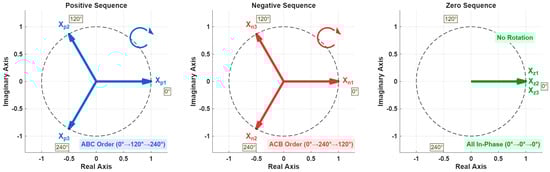 The decomposition yields three sets of symmetrical components: the positive-sequence x _ p 1 , x _ p 2 , x _ p 3 , the negative-sequence x _ n 1 , x _ n 2 , x _ n 3 , and the zero-sequence x _ h 1 , x _ h 2 , x _ h 3 , derived from the unbalanced system x _ 1 , x _ 2 , x _ 3 using the Fortescue operator e j 2 π 3 . The characteristic spatial orientation of each sequence, which provides a clear means of differentiation, is depicted in Figure 2 [35].