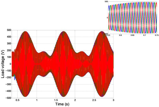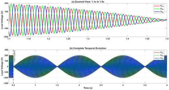 The initial simulation of the system depicted in Figure 1, under a frequency deviation of f p v = 1   H z between the PV generator and the grid, clearly illustrates the problem. As shown in Figure 3, the load voltage exhibits significant fluctuations, a phenomenon known as voltage flicker, immediately after the fault inception at t = 0.5 s. This flicker is a direct consequence of the frequency unbalance, which the classical grid control systems, based on a single-frequency assumption, cannot compensate for.