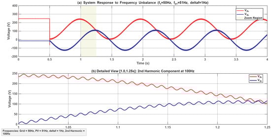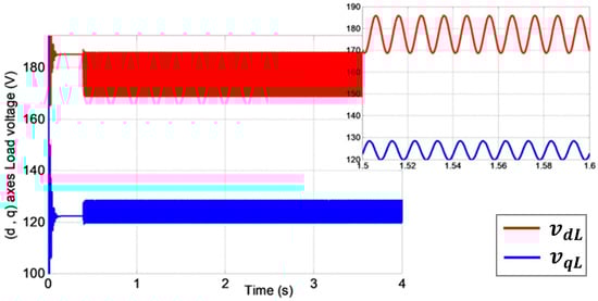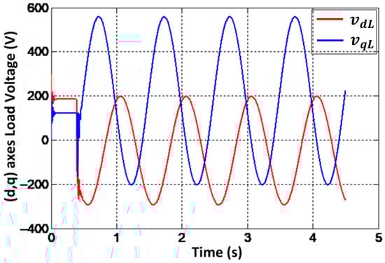 Further analysis in the synchronous reference frame provides deeper insight. The ( d , q ) axis components of the load voltage ( v d L , v q L ) , presented in Figure 4, are not constant as they would be in a perfectly balanced and synchronous system. Instead, they exhibit persistent oscillations at the frequency of the deviation, f p v   ( 1 H z ) . This oscillation confirms that the standard Park transformation, which locks onto the grid frequency f s , is unable to decouple the variables when the source (PV generator) operates at a different frequency.