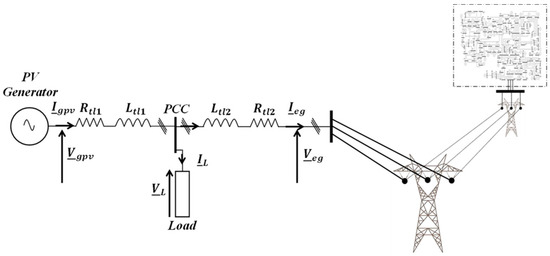 To obtain the simulation results shown in Figure 3, fundamental circuit laws were applied to the electrical system comprising the photovoltaic generator, the load, and the electrical grid. The voltage across a single phase of the load is given by the following expression: v 1 L t = R L i 1 L ( t ) + L L d i 1 L ( t ) d t where R L and L L represent the resistance and inductance of the single-phase load, respectively, and i 1 L is the current through it. The current in the single-phase load is defined as: i 1 L t = i g p v 1 t + i e g 1 ( t ) where i g p v 1 t and i e g 1 ( t ) are the currents in the first phase of the photovoltaic generator and the electrical grid, respectively. Applying Kirchhoff’s voltage law to the PV generator-load loop yields: v g p v 1 t = R g p v i g p v 1 t + L g p v d i g p v 1 ( t ) d t + v 1 L ( t ) where v g p v 1 t is the first-phase voltage of the photovoltaic generator, i g p v 1 t is its current, R g p v and L g p v are the resistance and inductance of its first phase, respectively. Similarly, applying Kirchhoff’s voltage law to the electrical grid-load loop gives: v e g 1 t = R e g i e g 1 t + L e g d i e g 1 ( t ) d t + v 1 L ( t ) where v e g 1 t is the first-phase voltage of the electrical grid, i e g 1 t is its current, R e g and L e g are the resistance and inductance of the grid’s first phase.