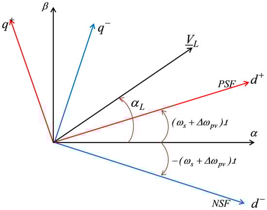 To investigate the origins of the fluctuations observed in the positive sequence v d p L + , v q p L + and negative sequence v d n L , v q n L components, the mathematical expressions for the positive ( x _ p k ) , negative ( x _ n k ) , and zero ( x _ h k ) sequence components are derived with respect to the positive and negative synchronous reference frames (PSF, NSF). These formulations are presented in Equation 8 [40].