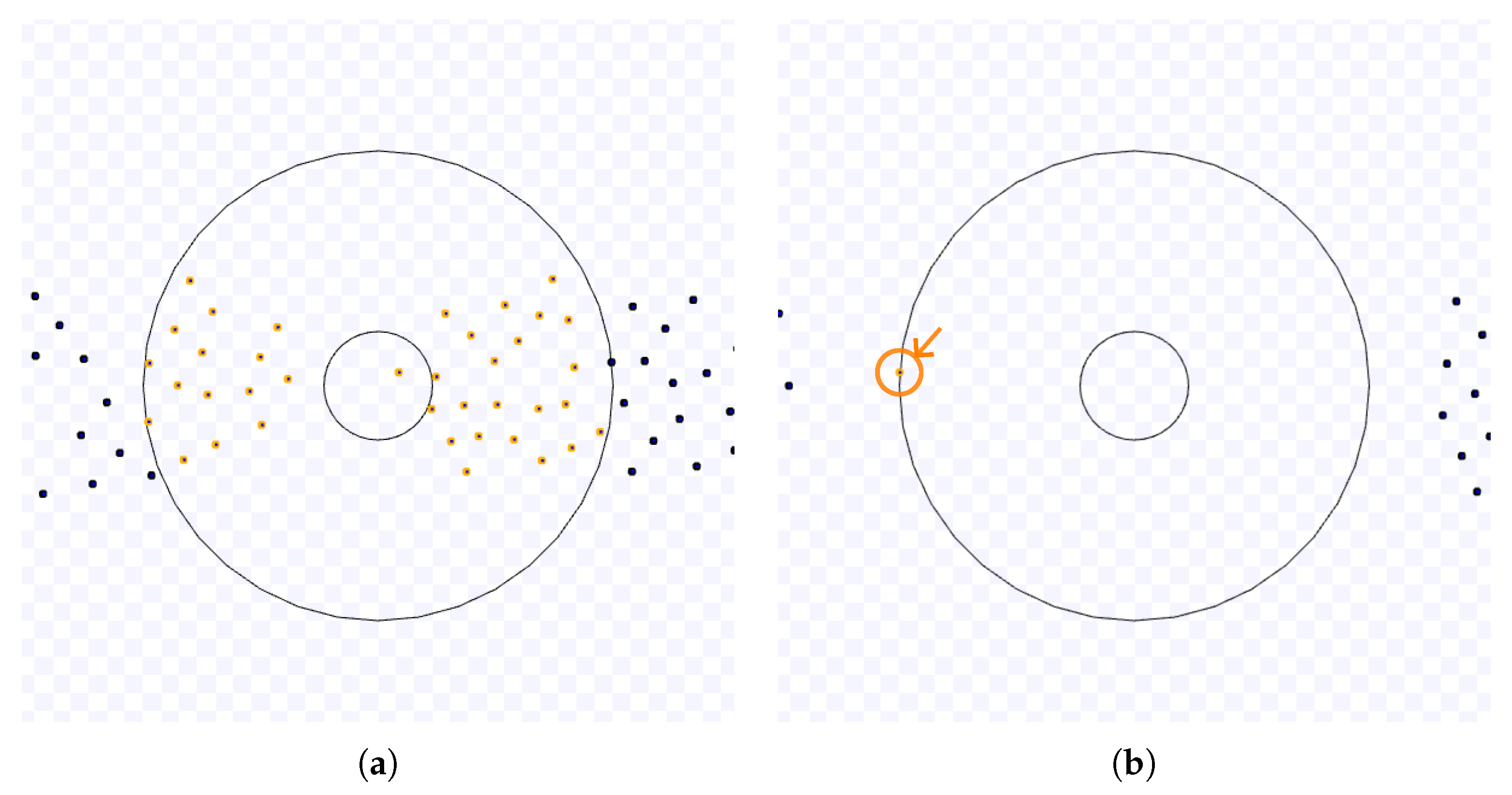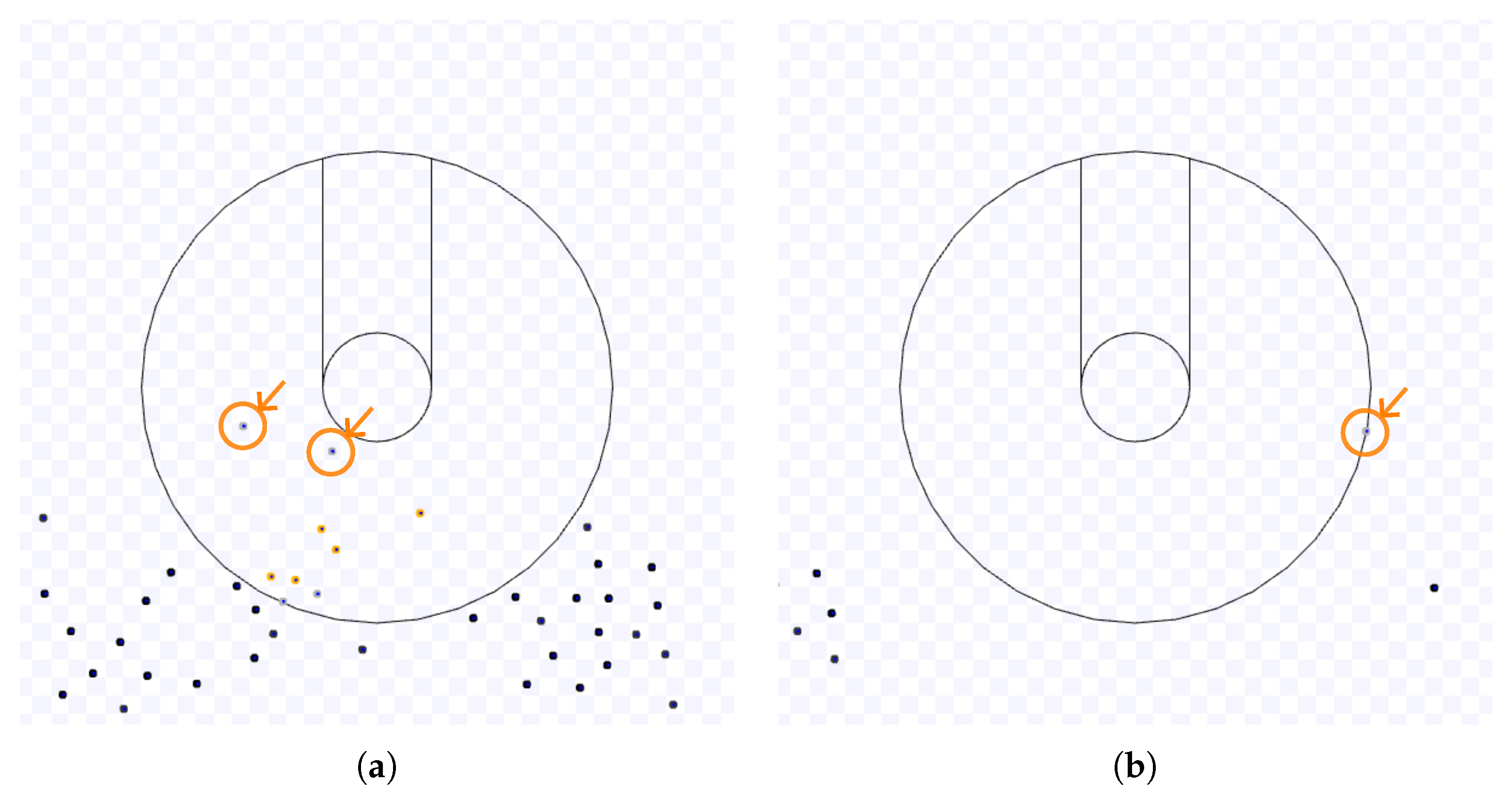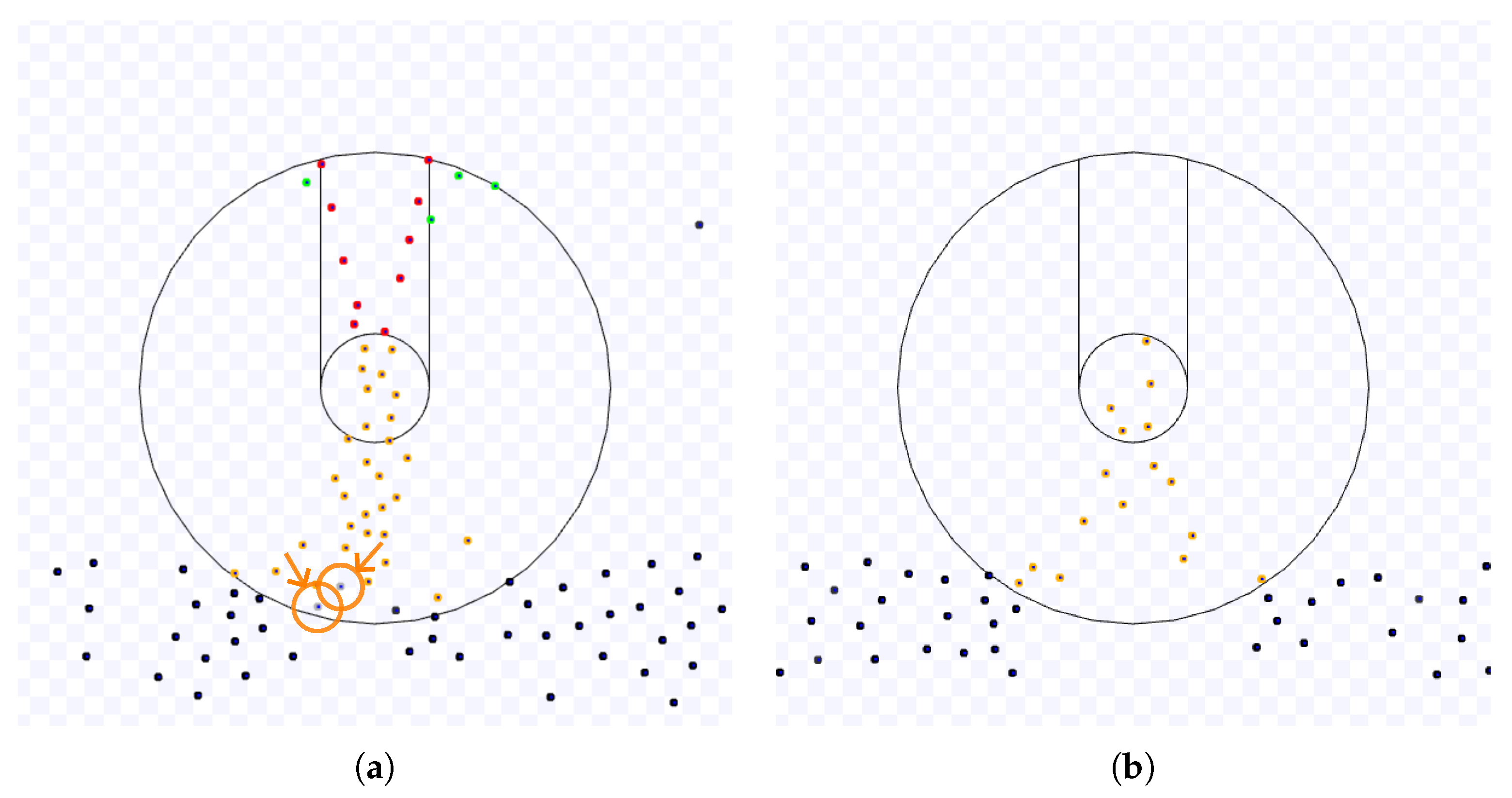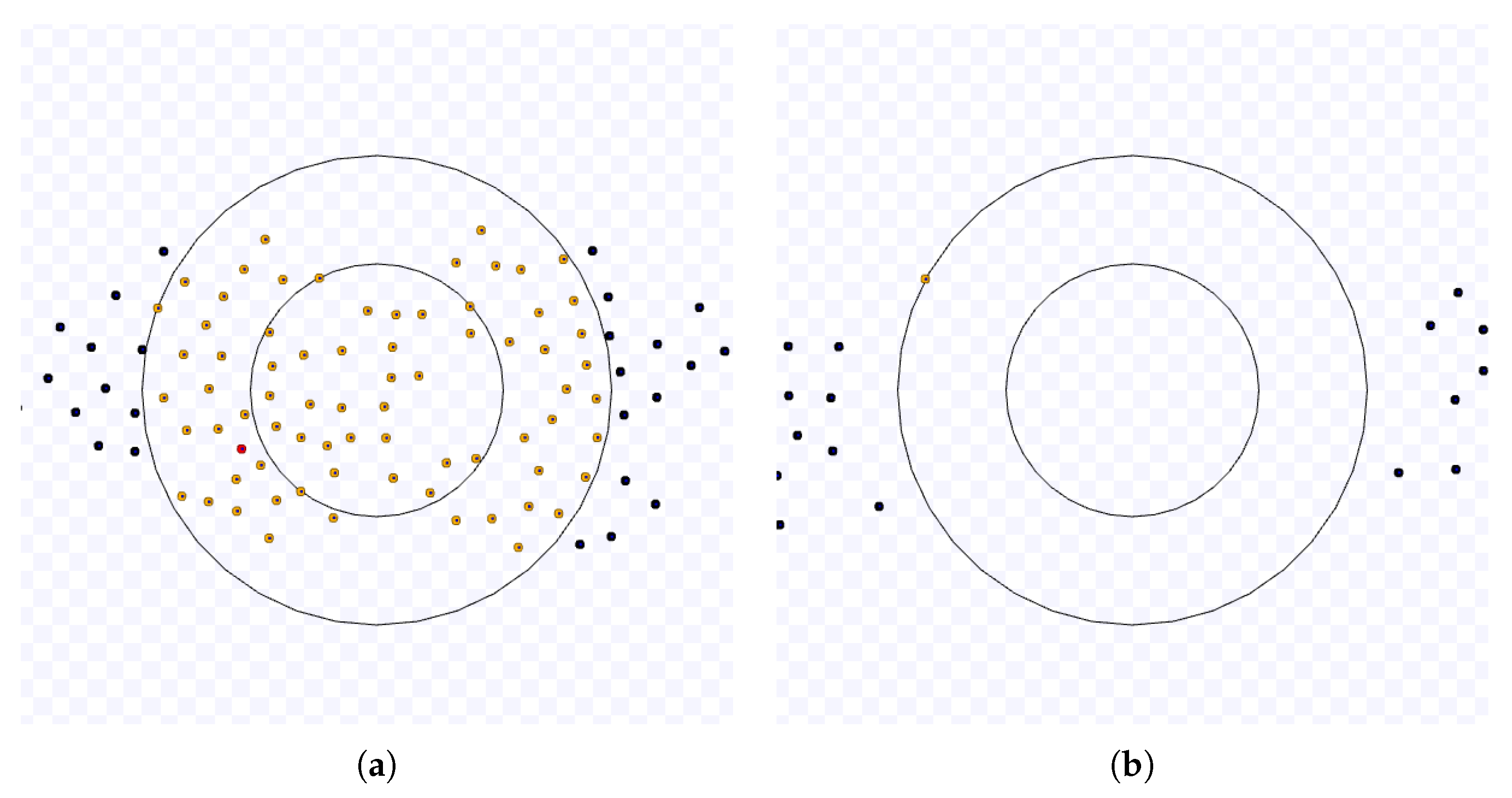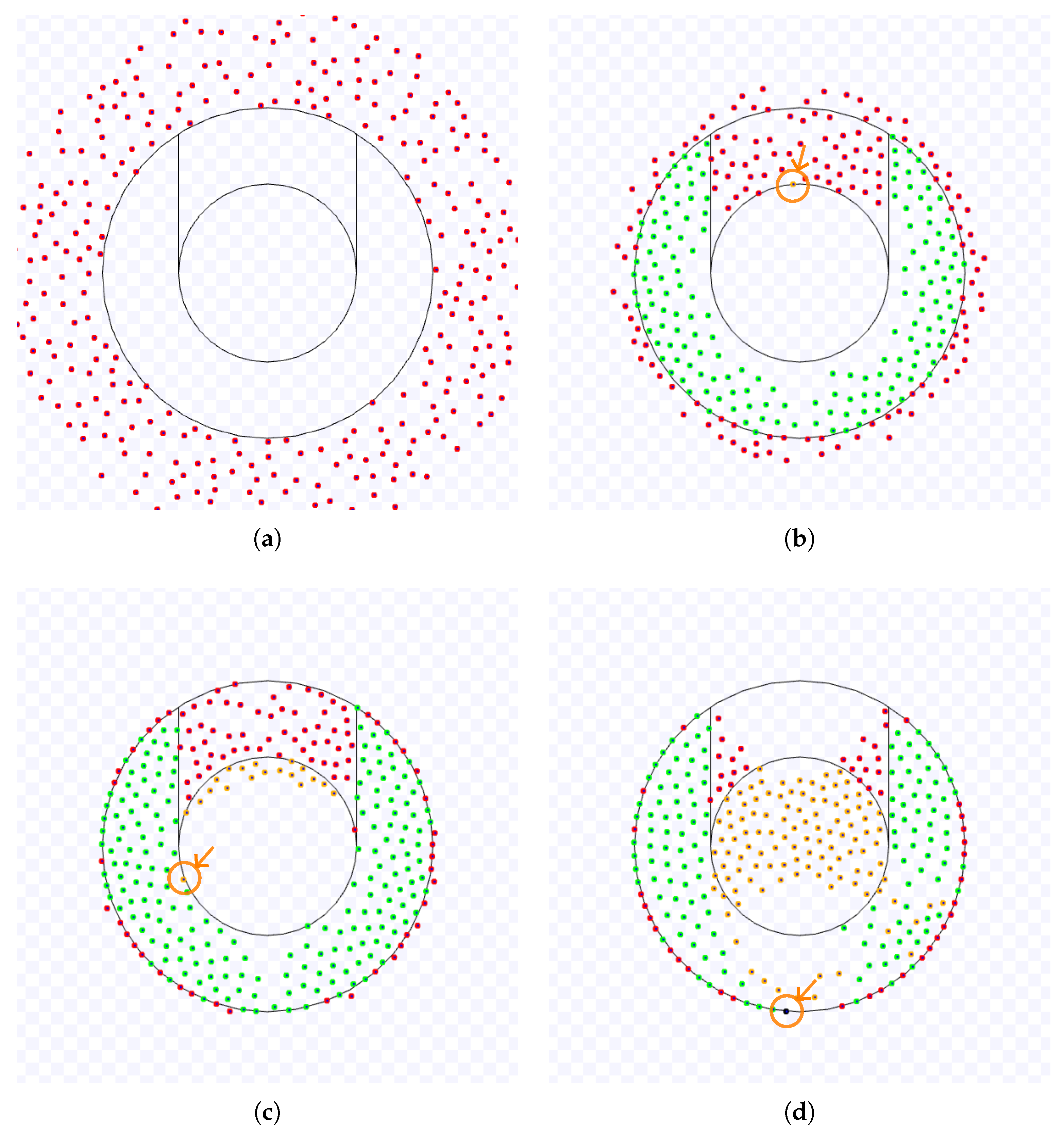 In this scenario, the coordination algorithms, if applied, are only employed inside a working area, that is, a circle of radius around the target. Although the swarm density is not considered as an explicit parameter in this work, the number of robots N and the radius D of the working area yield the swarm density . If the robots have two or more targets, the targets are apart by at least . The initial position of the robots has a distance from the target centre randomly chosen from a uniform distribution in m for a fixed E. The angle between the initial position of a robot and the x-axis is selected from a uniform distribution in rad. To avoid robots starting in the same position and crashes between robots at the beginning of the simulation, if the distance between a robot and any other is less than 1 m, its initial position is selected again. This arrangement inside an annulus is only considered at the start of an experiment and before the initial target.