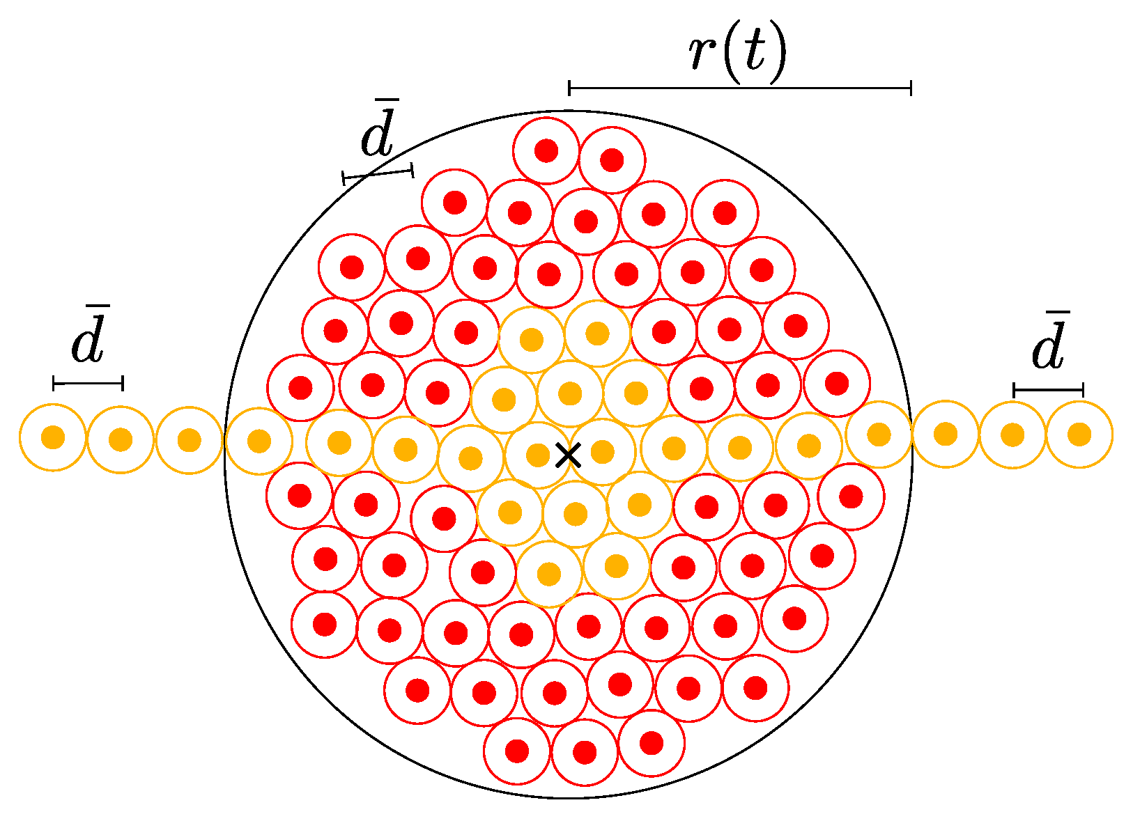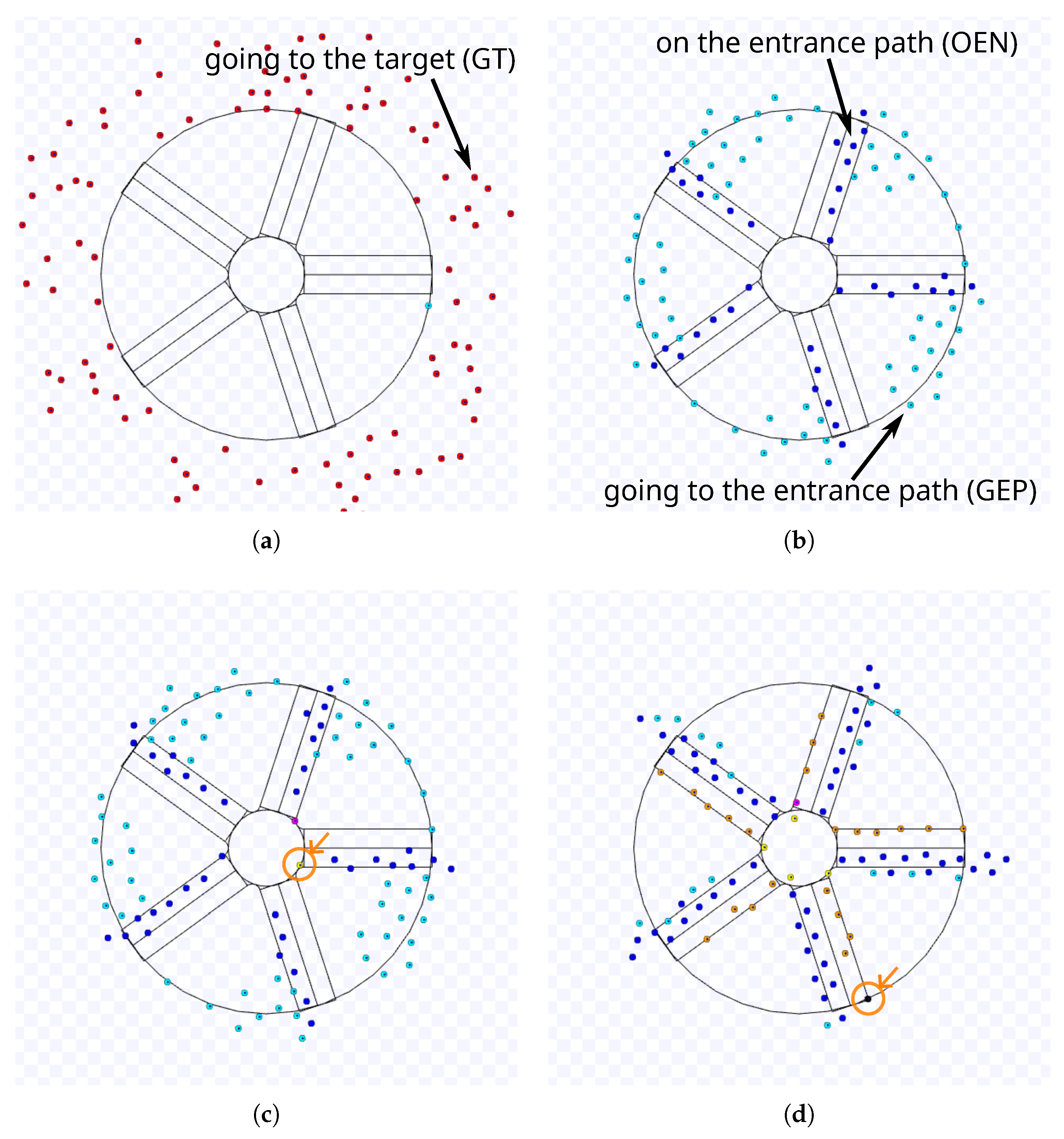 Definition 1. The task completion time is obtained from the last robot to leave the working area around the shared target area, that is, the maximum time to enter the shared target area plus the time to leave the working area for every robot in the swarm.