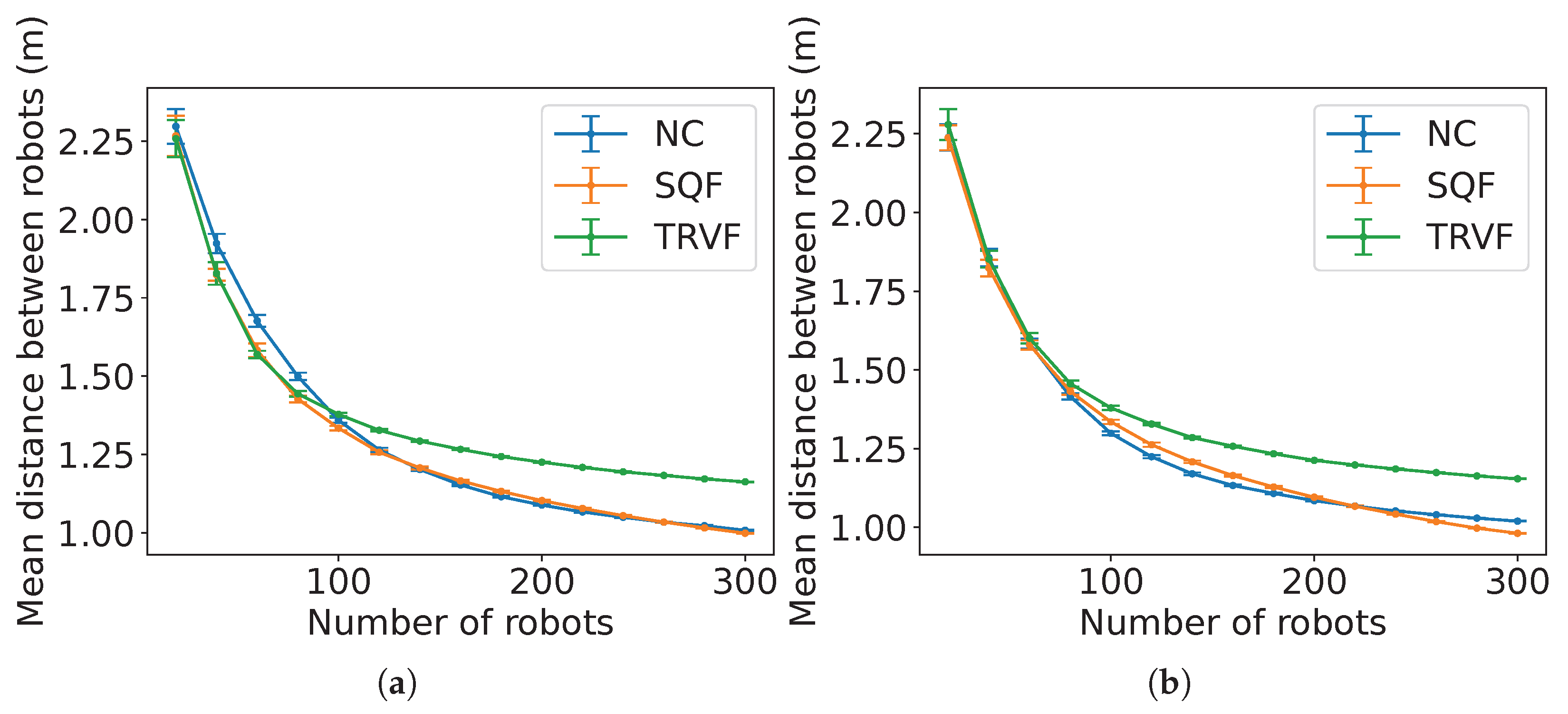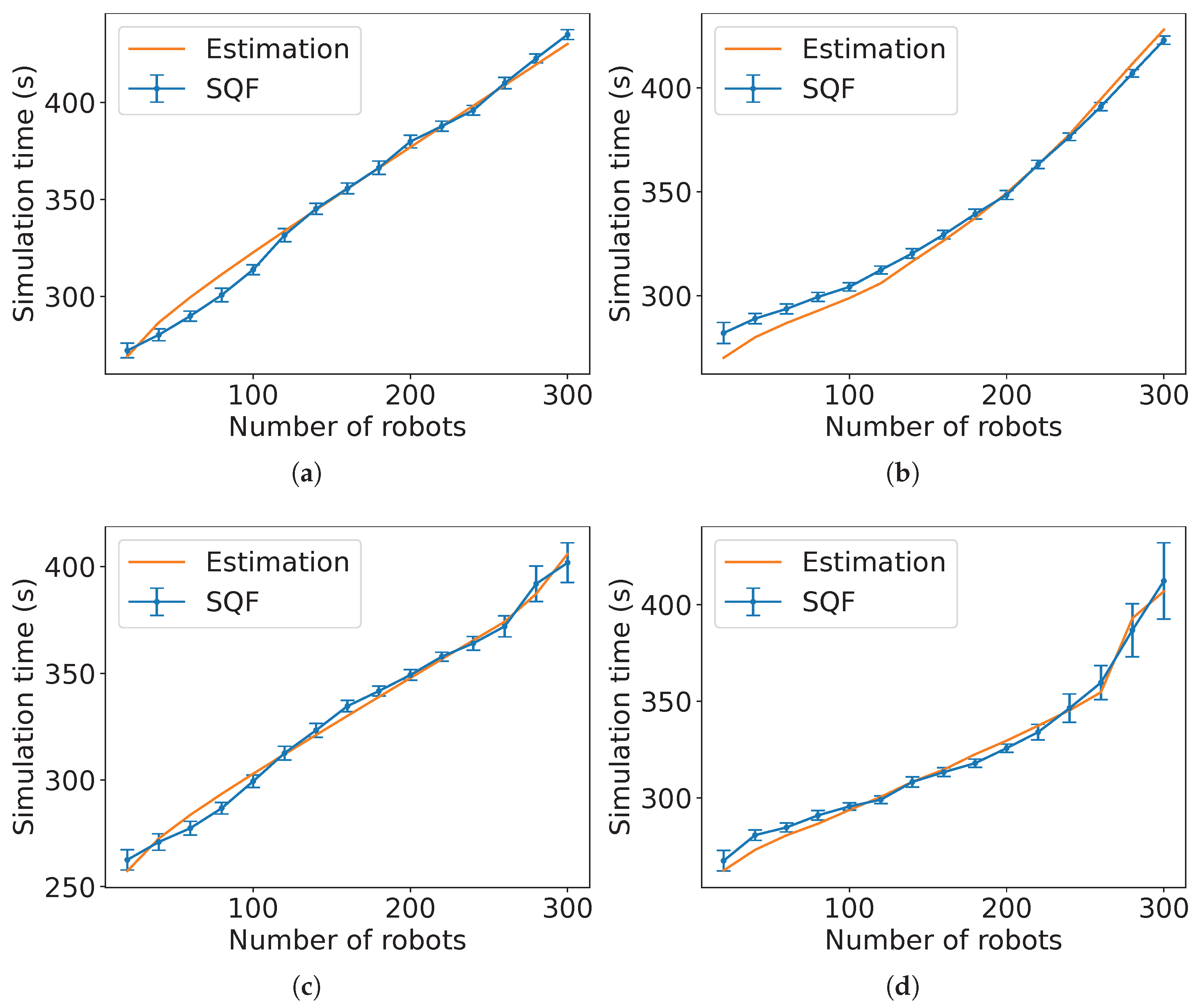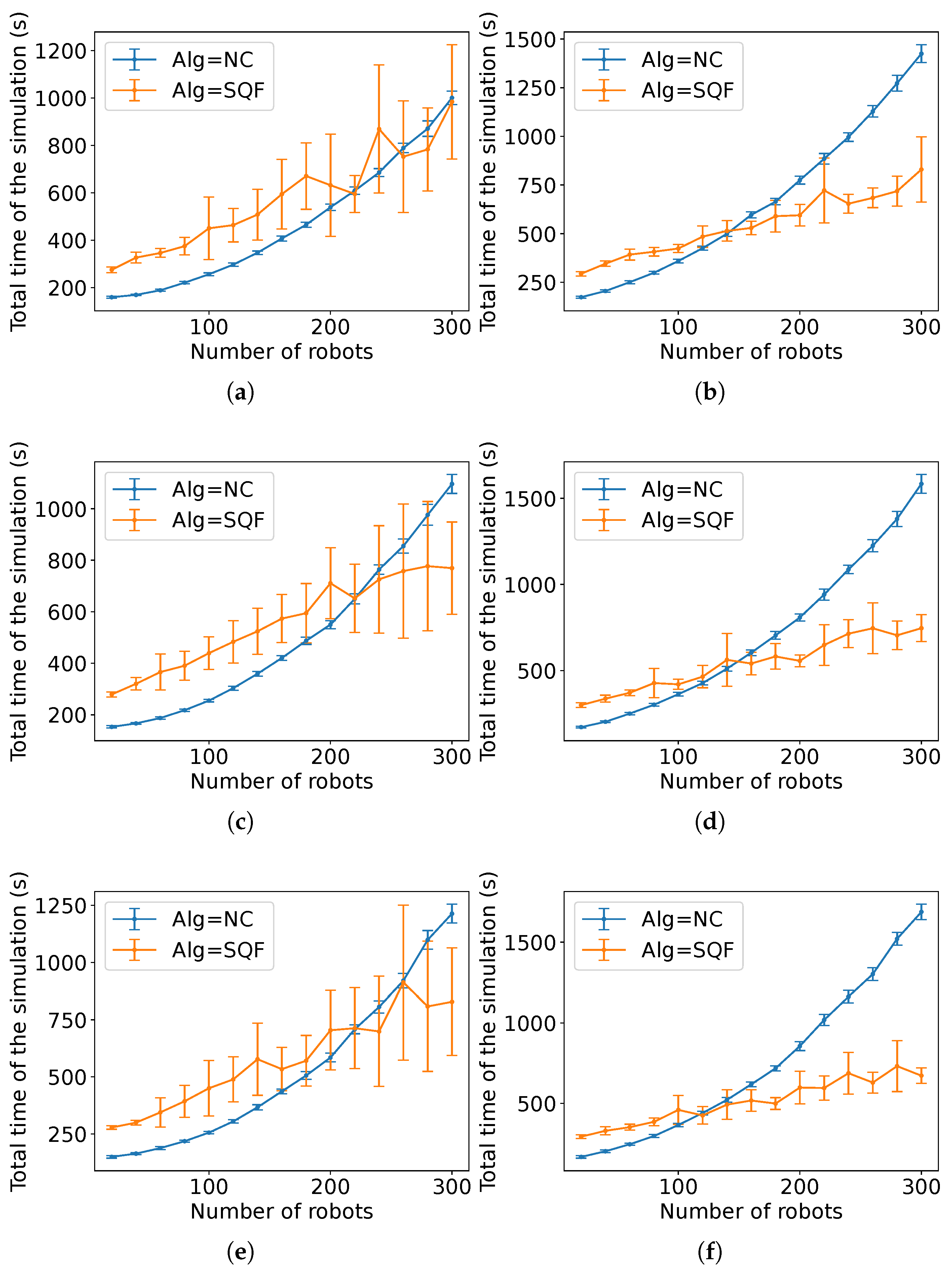decreases because it is expected that these constants are proportional to the number of robots executing the algorithm associated with each of them. Although the values of the constants are different, the trend for the SQF algorithm is similar for both robots’ movement types (