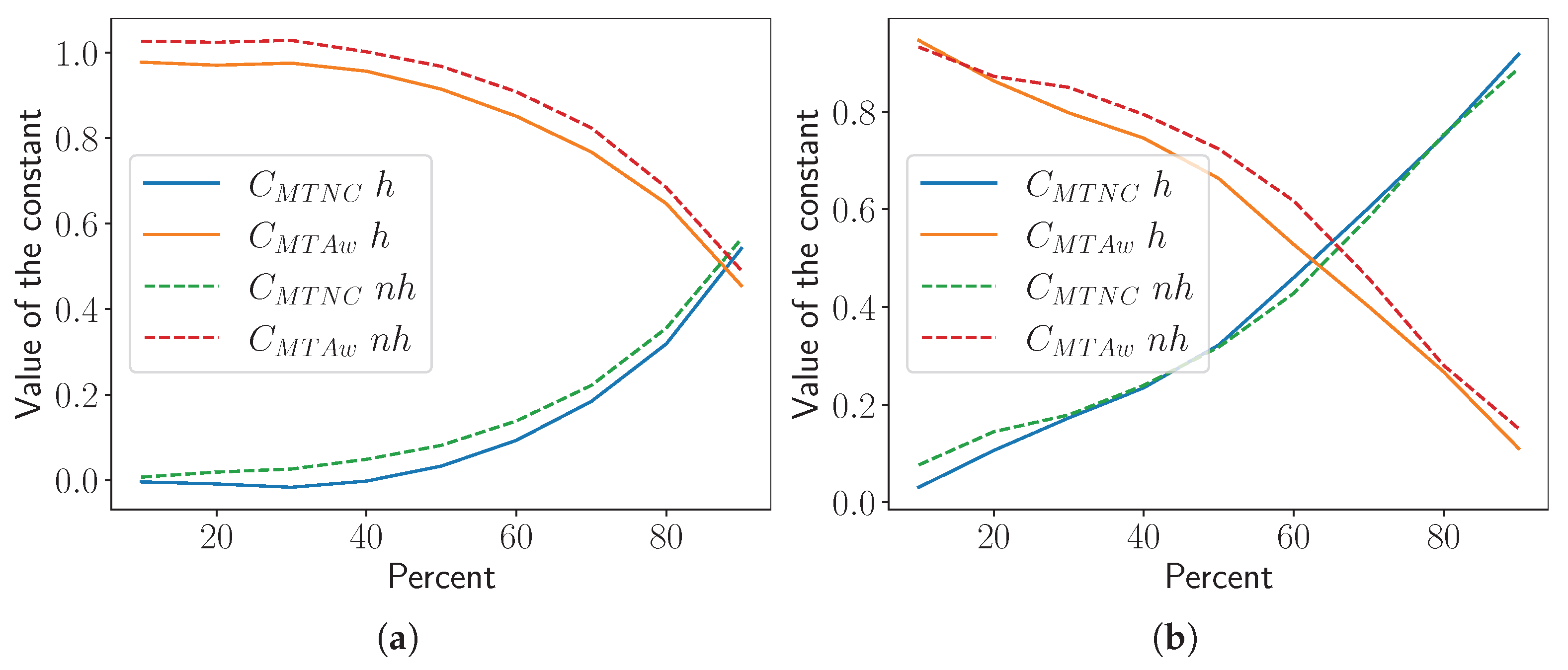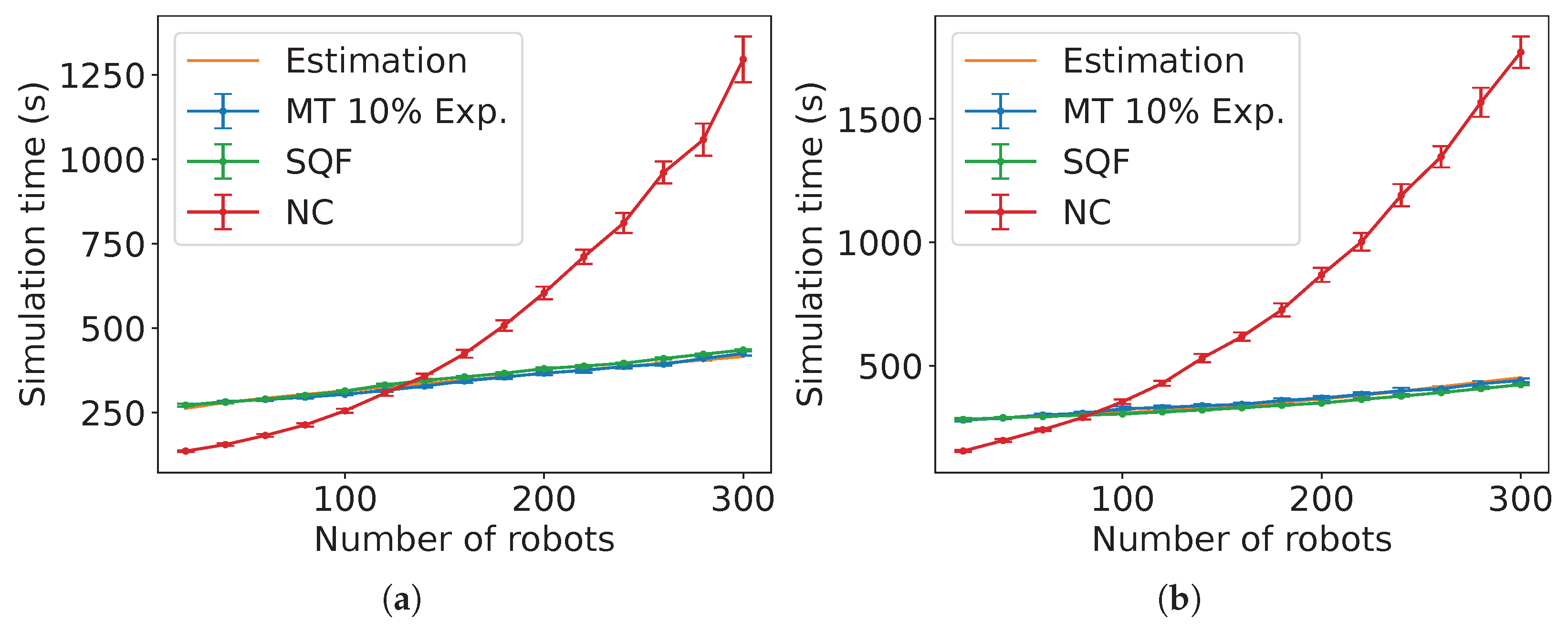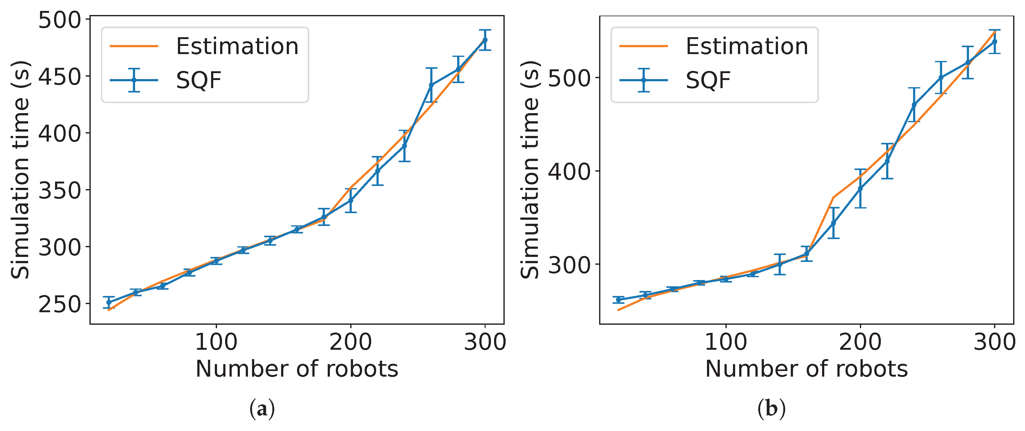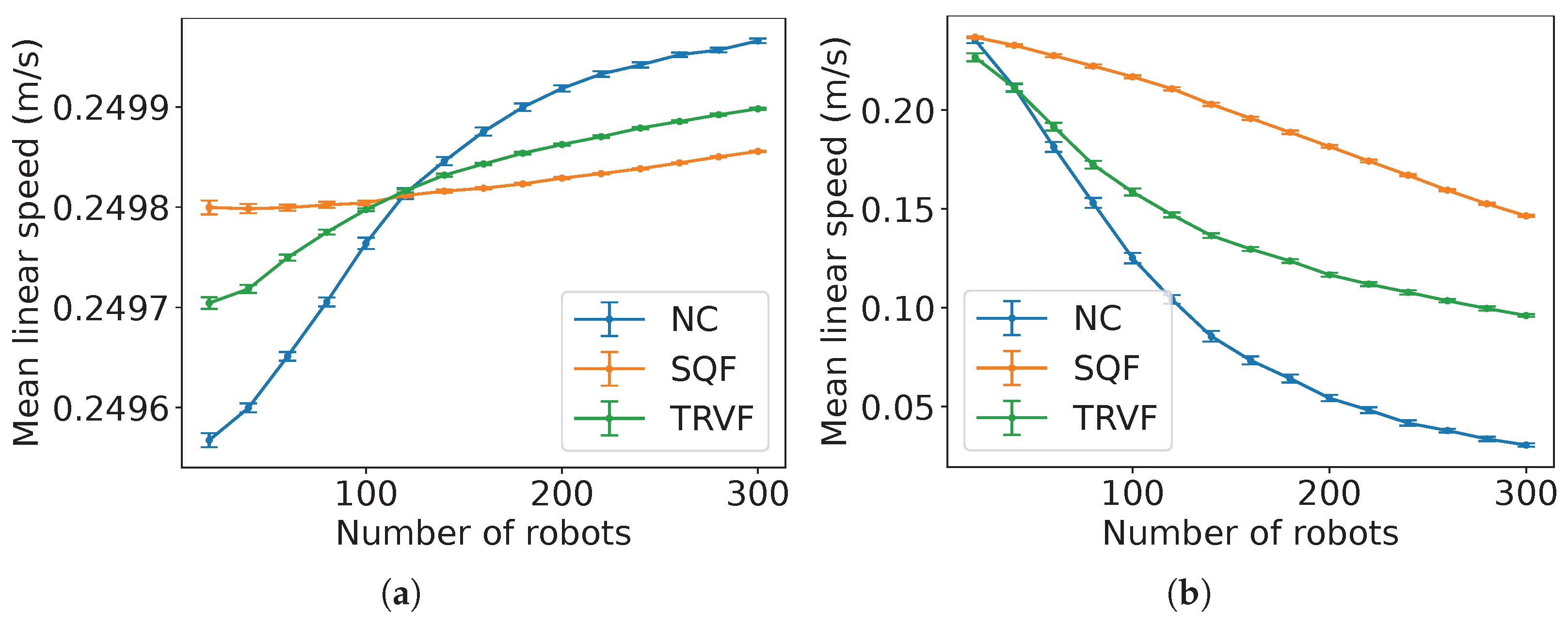 decreases because it is expected that these constants are proportional to the number of robots executing the algorithm associated with each of them. Although the values of the constants are different, the trend for the SQF algorithm is similar for both robots’ movement types (