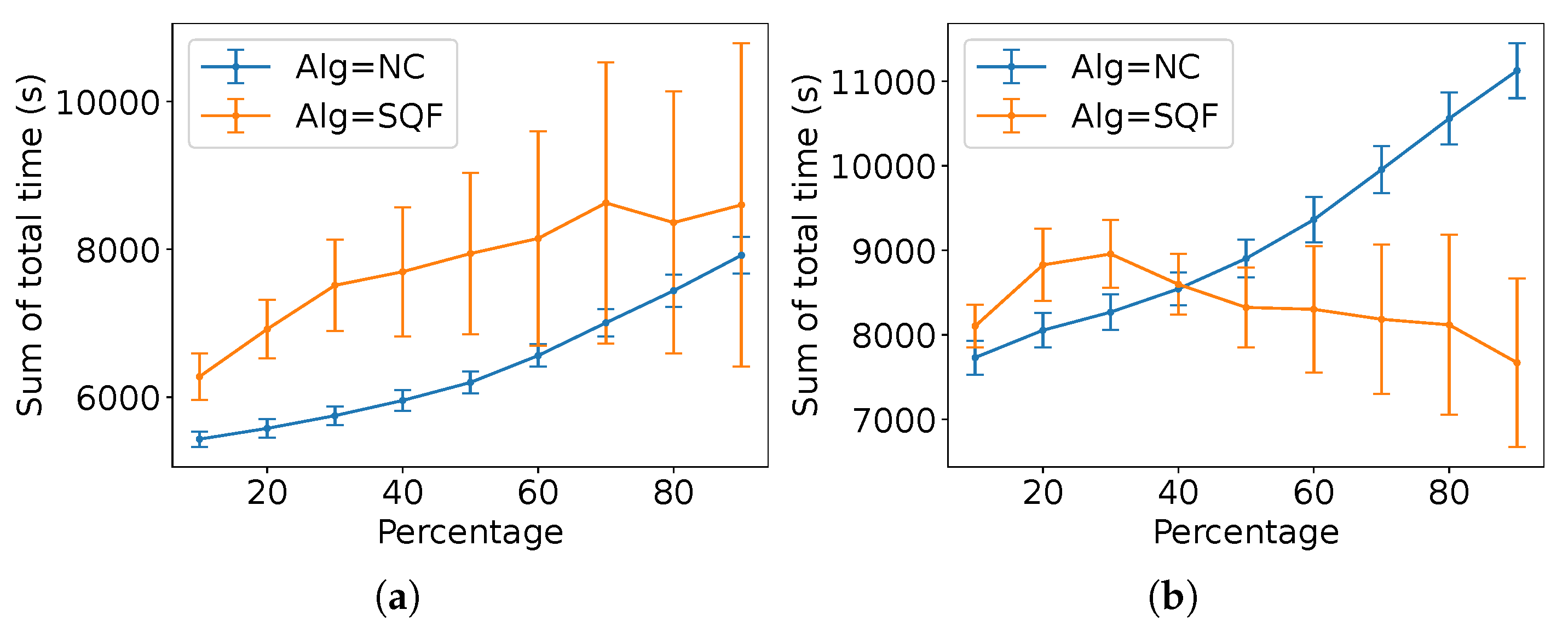 of robots in group A and SQF as the control algorithm of the robots in group B. For reference, the task completion time from the experiments of SQF and NC is shown.