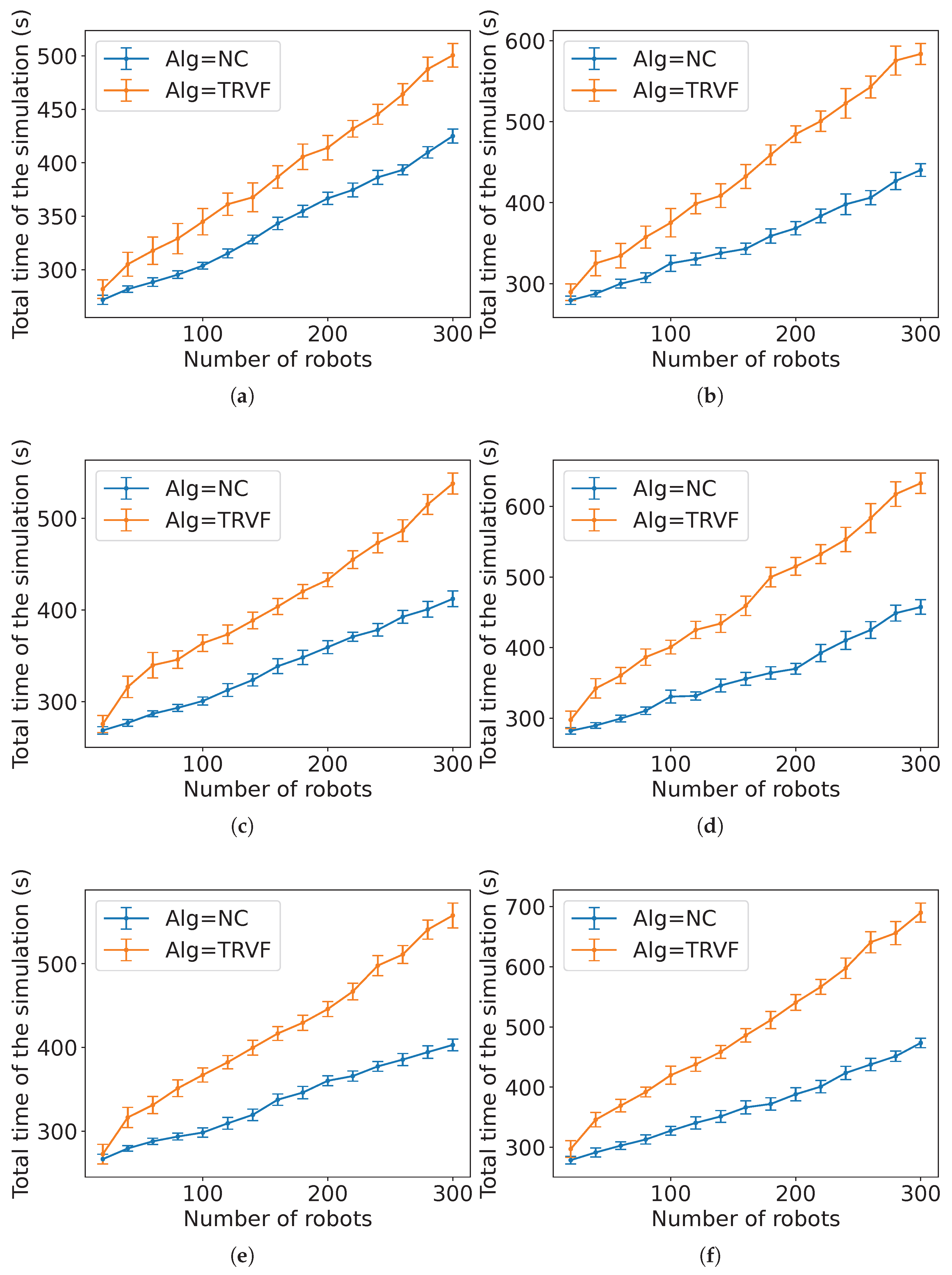 In addition, this work assumes a fixed working area. That being so, notice that the influence of the number of robots has a limit because a higher number will clutter the environment, no matter the algorithm. Thus, the parameters related to the environmental area affect these functions in this sense.