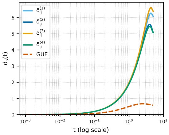 The GUE-based Hamiltonian exhibits a distinct spectral morphology. While it still departs from classical Weyl scaling, its profile shows slower decay: remains larger over an extended range of t, approaching unity before eventual suppression. This indicates that coherence propagation in the GUE ensemble is less constrained and supports broader entropic influence. The arithmetic Hamiltonians, by contrast, maintain and exhibit sharper compression, confirming that the severe dimensional reduction observed for the primes cannot be attributed to random-matrix-type level statistics alone.