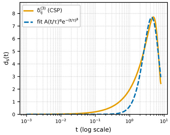 in log–log coordinates, extracting the exponent by least-squares regression. The corresponding effective spectral dimension follows from the Laplace–Tauberian correspondence in Section 2.4: