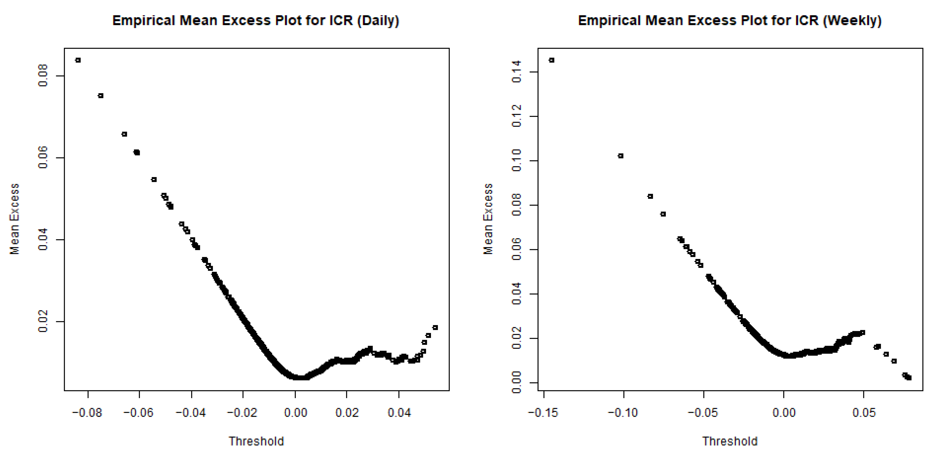 Figure 2), which shows approximate linearity beyond the 95th percentile for both daily and weekly returns. This indicates a stable cutoff for modeling extremes. Therefore, the 95% quantile is adopted, balancing sufficient tail coverage with an adequate number of exceedances for reliable GPD estimation.