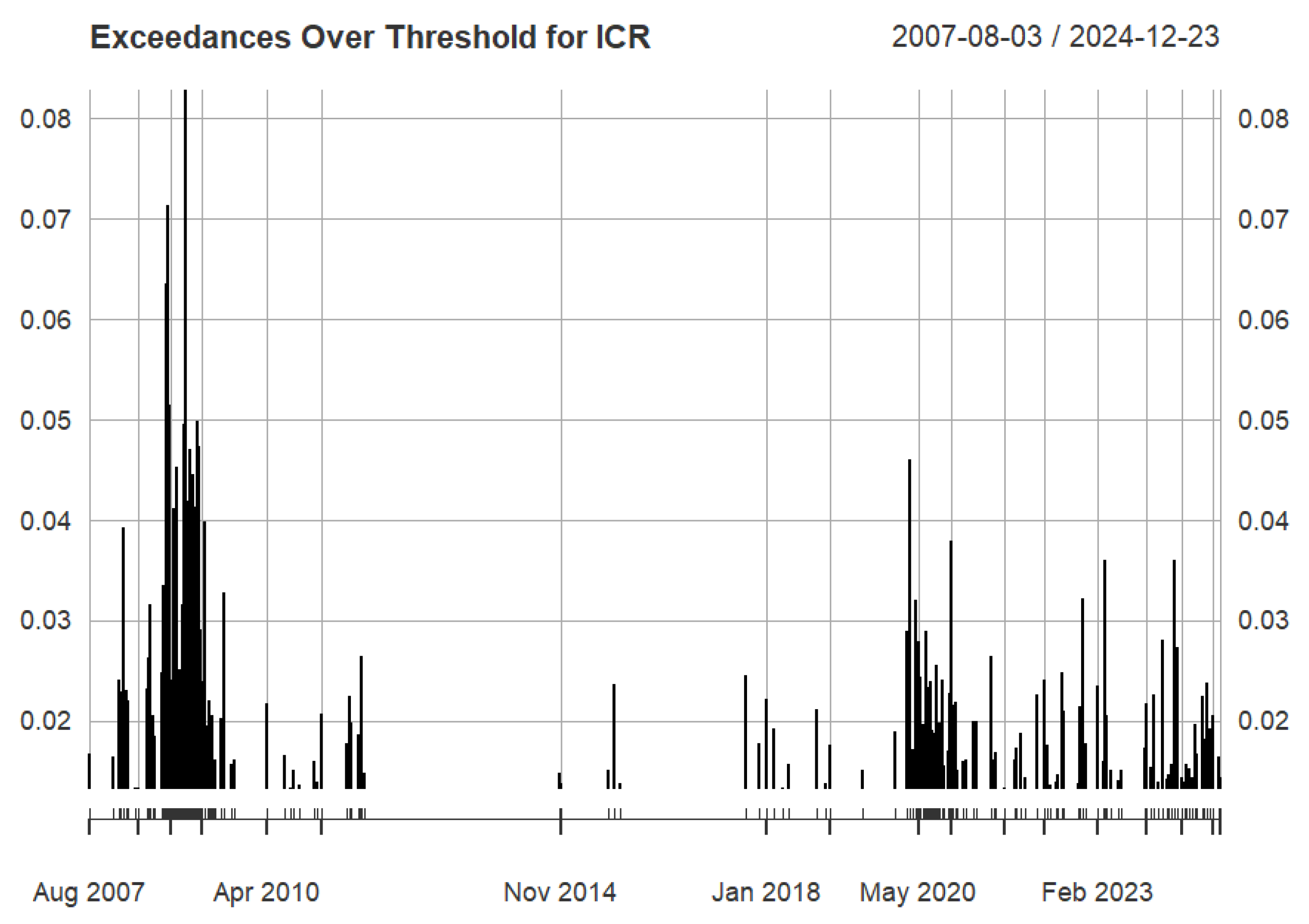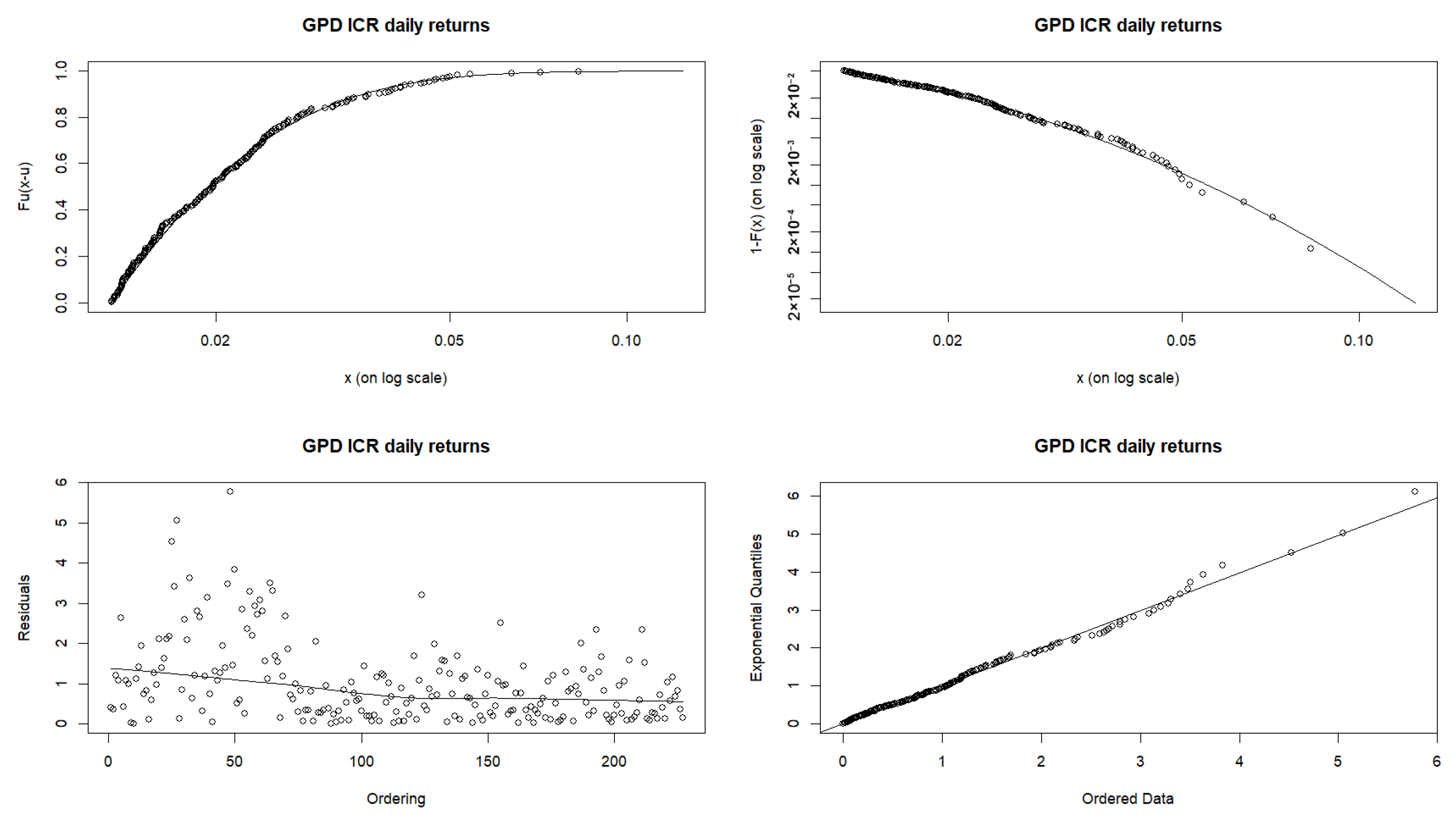 Finally, the study isolates , removes the effect of overall market movements by subtracting the SPY component using the estimated beta coefficient of the factor model. The resulting series is then used in our EVT analysis to examine the specific tail risks for the insurance sector. To focus on losses (the left tail of the return distribution), the study inverts the ICR values by setting .
