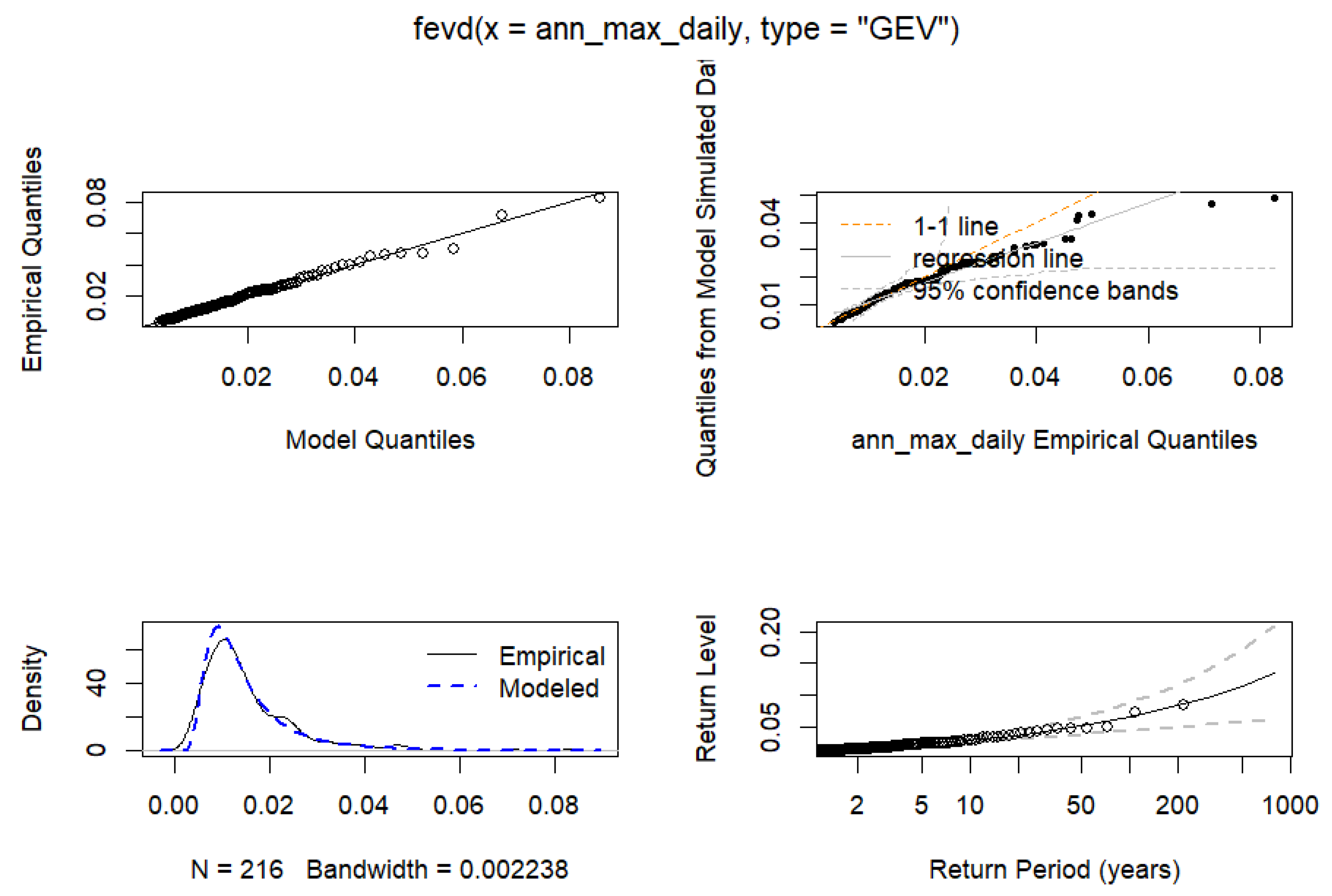 Table 4 gives the point and interval estimates at a 95% confidence interval for both block maxima. The point estimate