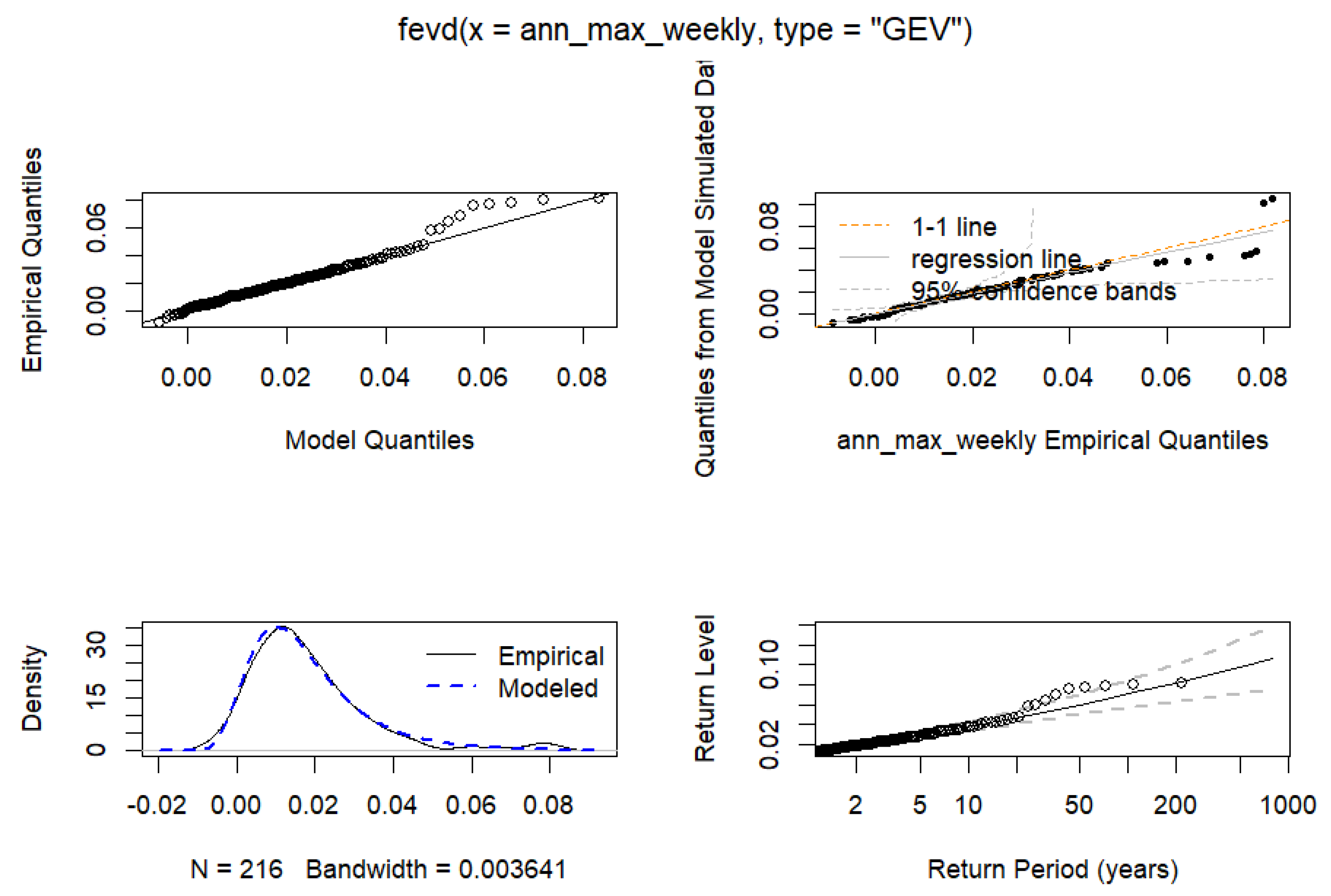 From the above table, the POT daily estimates indicate that the insurance climate risk portfolio is not expected to lose more than 1.327% in a given day. However, if this threshold is breached, the expected loss increases to approximately 2.284%, reflecting the severity of extreme climate-driven shocks. In contrast, the Block Maxima method applied to daily returns blocked monthly produces higher tail risk estimates, with a VaR of 3.642% and a CVaR of 5.681%.