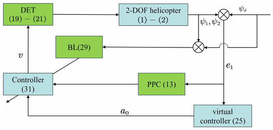 Event-triggered mechanisms (ETMs) effectively reduce communication overhead but may compromise tracking accuracy and even affect system stability. Simultaneously, a two-degree-of-freedom helicopter constitutes a nonlinear, strongly coupled MIMO system with time-varying parameters and uncertainties. Beyond minor steady-state errors, safety and mission requirements necessitate explicit specifications for transient and steady-state performance metrics, such as overshoot, convergence rate, and residual limits. Therefore, integrating a prescribed performance function (PPF) is crucial for enhancing system tracking performance [17,18]. Currently, extensive research has been conducted on PPFs for nonlinear systems. For instance, to address control challenges in vehicle active suspension systems, ref. [19] introduced a novel control scheme based on a specified performance function. This approach efficiently characterizes both the convergence rate of the tracking error and the peak overshoot. In [20], the authors proposed an adaptive saturated command performance control problem for air-breathing hypersonic vehicles subject to parameter uncertainties and unknown external disturbances. In [21], the author proposed a sliding mode control scheme for uncertain nonlinear systems, which exhibits precise convergence time characteristics. To address the challenge of robust attitude control for a 2-DOF helicopter under fixed-time constraints, the authors in [22] proposed a control strategy that integrates a sliding mode switching mechanism with an innovative arrival law. This approach ensures effective attitude control under input saturation while satisfying prescribed performance (PP) requirements. Additionally, to meet the practical control needs of coaxial composite helicopters, ref. [23] presented a performance-based envelope protection control strategy to enhance flight safety. By defining PP boundaries, the proposed scheme achieves the desired transient response. Despite the significant progress made in PP control, no existing research has yet addressed the control of 2-DOF helicopter systems based on both DET and PP, which motivates further investigation.