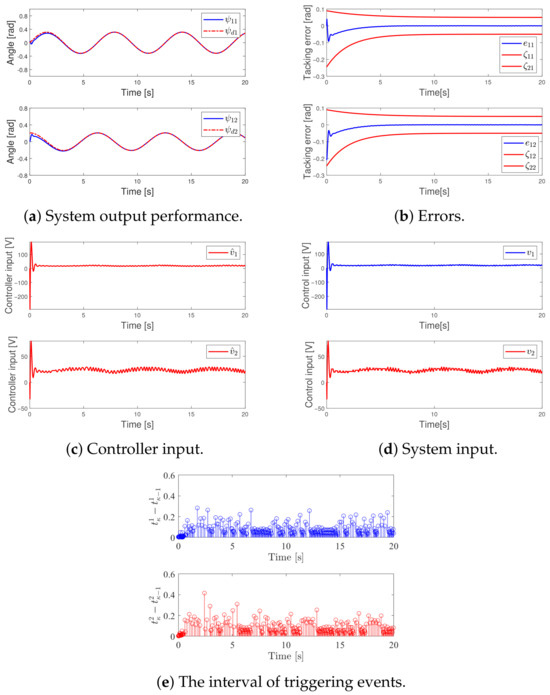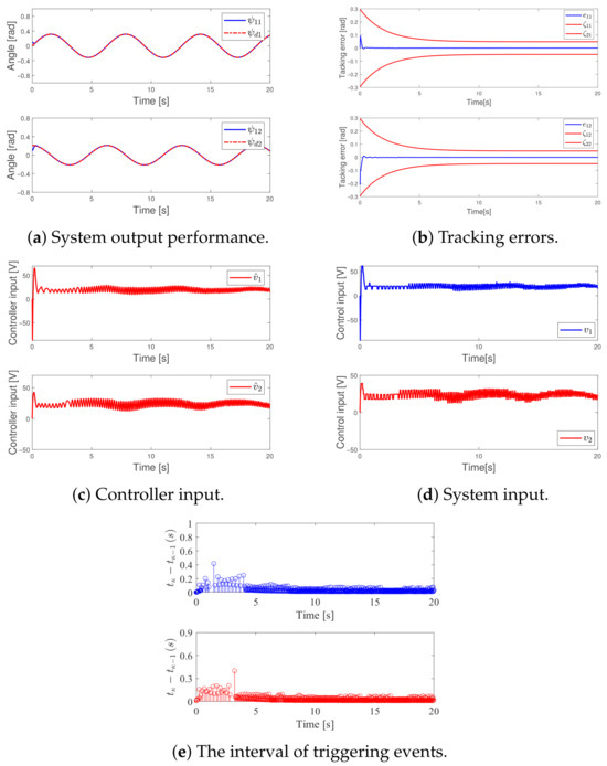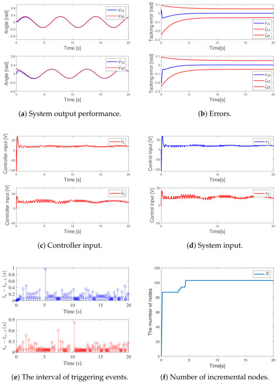 Figure 4a depicts the system output’s dynamic characteristics, whereas Figure 4b demonstrates the progression of the tracking error. Meanwhile, Figure 4c,d illustrate the changes in the controller signal and the corresponding input response behavior, respectively. Figure 4e depicts the temporal distribution of trigger events, with a total of 631 and 632 occurrences, respectively.