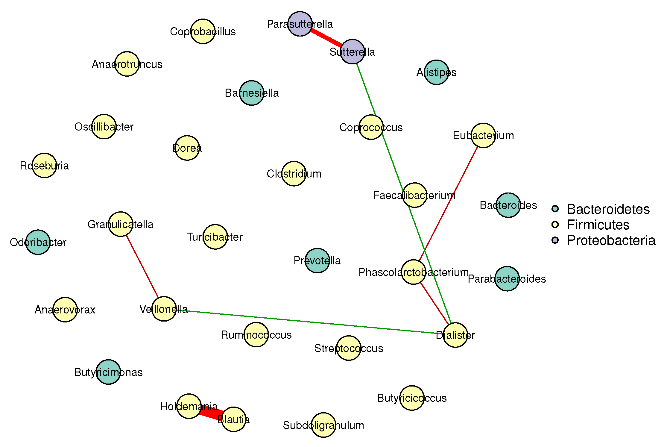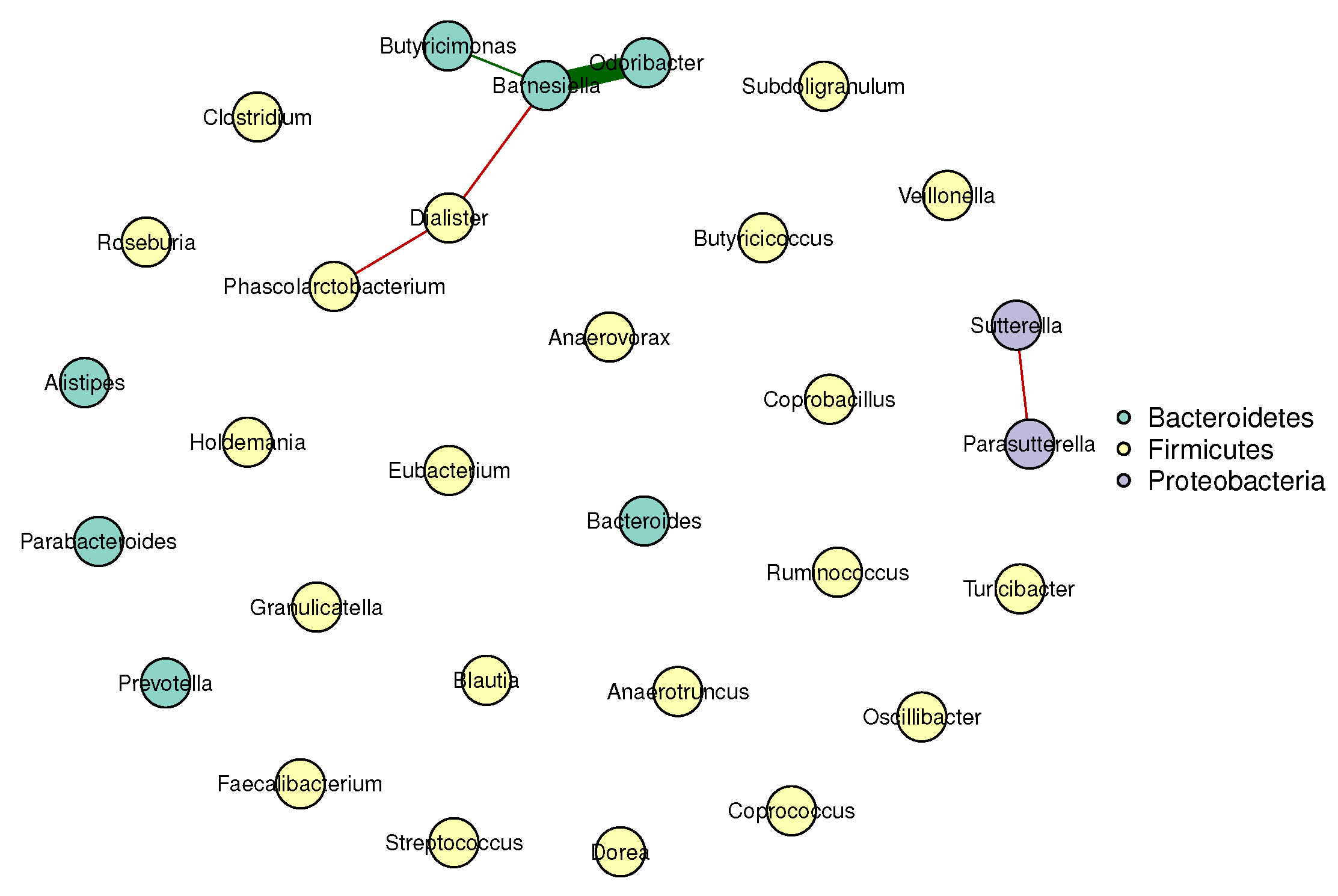 - Reduced network complexity in obesity: The obese group had fewer stable edges (five, compared to seven in the lean group) and a lower mean edge strength (0.25, compared to 0.32 in the lean group). These observations indicate weakened conditional associations between bacterial genera in obese individuals, suggesting a decline in gut microbial network complexity.
