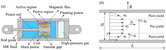 This work analyzes the hydrodynamic behavior of an MR valve that regulates and restricts flow by applying a magnetic field to the fluid, thereby generating a damping force. Figure 1a illustrates the MR valve scheme based on a monotube damper constructed as a cylindrical tube, where the floating piston separates the MR fluid and the high-pressure gas. At the same time, the main piston separates the compression chamber (fluid volume between the floating piston and the main piston) and the rebound chamber (fluid volume between the rod guide and the main piston) [3,13,23,24]. During the main piston movement, which occurs when the piston rod enters and leaves the cylinder, the MR fluid flows through the control valve in the annular gap. Meanwhile, the high-pressure gas chamber adapts to the volume changes between chambers and provides a spring effect that returns the MR damper to its extended shape when no force is applied. The MR valve incorporates an electromagnetic coil in the main piston, with electrical connection through the thru-hole in the piston rod, which generates magnetic flux lines that pass through two regions in the annular gap (active regions) and leave an area in the middle where there is no magnetic field (passive region) [24]. In the active region, the magnetic field controls the fluid resistance to deformation, regulating the transfer of liquid volume between the compression and rebound chambers [14]. Furthermore, the MR valve channel is modeled as fixed parallel plates, considering that the annular gap is smaller than the annular radius [23,24]. Figure 1b shows the velocity profile of an MR fluid based on the Bingham rheological model in the active region of the MR valve in Figure 1a, where the magnetic field is perpendicular to the fluid flow. The origin of the Cartesian coordinate system is at the bottom of the channel of height H and length L. The plug thickness with velocity , also known as the pre-yield region, indicates that the shear stress is lower than the yield stress. As a result, this fluid volume behaves as a rigid body whose velocity magnitude is determined by viscous drag effects from the neighboring layers with velocities and . On the other hand, the post-yield regions represent the liquid volume obtained when the shear stress exceeds the yield stress. The distribution between solid and liquid regions depends on the competition between the shear stress generated by the pressure gradient and the yield stress due to the magnetic field B. Hence, the interfaces and indicate the positions where the change from liquid to solid state occurs along the channel cross-section.