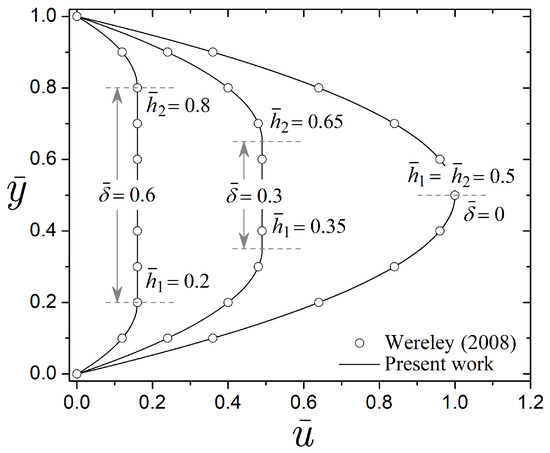 To validate the results of this investigation, Figure 2 shows a comparison between the velocity profiles of this work using Equations (44)–(46) and the following velocity profiles extracted from the work developed by Wereley [22]: