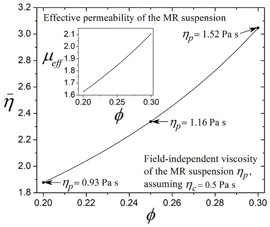 Magnetic particles dispersed in the carrier fluid control the properties of the MR fluid in Figure 3. This figure illustrates the effect of adding hard spherical particles to the carrier fluid on the viscosity ratio and effective permeability of the MR fluid, considering the range of for typical MR damper applications. It is important to consider that, for high particle concentrations above , the MR fluid can acquire the behavior of a solid paste, complicating fluid manipulation [2]. Conversely, in the absence of magnetic particles , the MR fluid recovers the viscosity of the carrier fluid according to Equation (28). Thus, in Figure 3, the field-independent viscosity of the MR fluid increases by incorporating particles into the carrier fluid, reaching the highest viscosity of when . Furthermore, the MR fluid obtains viscosities of and Pa s when and , considering a particular carrier fluid viscosity of Pa s (silicone oil) [27]. This increase in represents an increase in viscosity of the MR fluid of when and when compared to the initial viscosity of Pa s. In this context, the results in Figure 3 enable the evaluation of the Mason number or the Bingham number, assuming that the increase in viscosity contributes to the hydrodynamic stress. On the other hand, in the inset of Figure 3, the particle volume fraction also modifies the effective permeability of the MR fluid ( in Section 2.2), taking as a reference that [31,38]. According to the previous equation, the parameter provides the magnetic characteristics of the MR fluid, considering that the carrier fluid is non-magnetic; when , while and when and , respectively. Therefore, because the effective permeability is associated with the magnetization of the MR fluid, the fluid exhibits greater magnetic susceptibility as particle concentration increases, resulting in more significant magnetic stress (see Section 2.2). Also, the increase in magnetic particles modifies the capacity of the MR fluid to form chain-like structures when a magnetic field is applied, affecting the damping force that regulates flow through the valve.