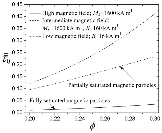 Another aspect to consider is that the MR fluid subjected to a magnetic field acquires the behavior of a semi-solid with a certain yield stress. This fluid condition is due to the alignment of particles in the direction of the magnetic field, resulting in chain-like structures that inhibit fluid motion. Figure 4 estimates the dimensionless yield stress for different particle volume fractions and magnetic fields B, considering hard spherical particles ( μm) of iron with kA m−1 [41]. Here, the parameter exhibits the ratio of the yield stress to the magnetic stress (magnetic attraction force between particles), comparing the reference mechanical resistance of the MR fluid at macro and micro scales [28]; see Section 3. For low magnetic fields, the magnetization of the MR fluid is proportional to (see Equation (6)). Carlson and Jolly [11] report that MR fluids exhibit approximately linear magnetic properties up to an applied field of about kA m−1 in this regime, while for intermediate magnetic fields, the magnetization of the MR fluid scales nonlinearly with (see Equation (7)). Finally, for high magnetic fields sufficient to achieve the saturation point, the yield stress is field-independent and proportional to (see Equation (8)). In Figure 4, the magnetic stress () scales with the average magnetization of particles (), which is generally larger than the magnetization of the MR fluid (). As a result, the magnetic stress exceeds the yield stress in all cases (), and thus . Moreover, the parameter at a high magnetic field is lower than at a low magnetic field due to the nonlinearity of the magnetization. Here, and when and with the low magnetic field ( kA m−1), while and when and with the high magnetic field ( kA m−1). Therefore, these results demonstrate that increasing from to (either for low, intermediate, and high magnetic fields) enhances the fluid resistance, assuming that the field-responsive effect of the MR fluid depends on the concentration of magnetic particles. Also, the most significant change in the dimensionless yield stress due to the increase in particle volume fraction occurs at the low magnetic field ( kA m−1).