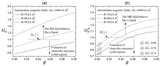 In the evaluation of the dimensionless parameters in this work, it is clear that the magnetic field strength contributes to the formation of particle chain-like structures, thereby increasing the MR fluid resistance. Nevertheless, magnetic particles experience viscous drag due to the pressure drop across the control valve. In this context, the dimensionless Mason number determines the competition between magnetostatic and hydrodynamic forces at the microscopic level, which establishes the pre-yield thickness of the MR fluid. Figure 5a shows the Mason number (see Equation (11)) as a function of the magnetic stress (see Equation (9)) for different values of the particle volume fraction and three intermediate magnetic fields B, considering a carrier fluid viscosity of Pa s and a strain rate of = 12,000 s−1 to estimate the hydrodynamic stress. In general, the Mason number decreases as the magnetic field magnifies the magnetic stress according to Equations (9) and (11), indicating that magnetic forces govern the microscopic behavior of the MR fluid. Meanwhile, the increase in magnetic particles reduces both the average magnetization of particles and the magnetic stress , increasing the Mason number. It is important to establish that the equilibrium between magnetic and hydrodynamic forces occurs when [2]. Once the hydrodynamic forces equal or exceed the magnetic forces , the MR fluid acts as a purely liquid layer [2,32].