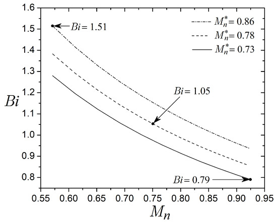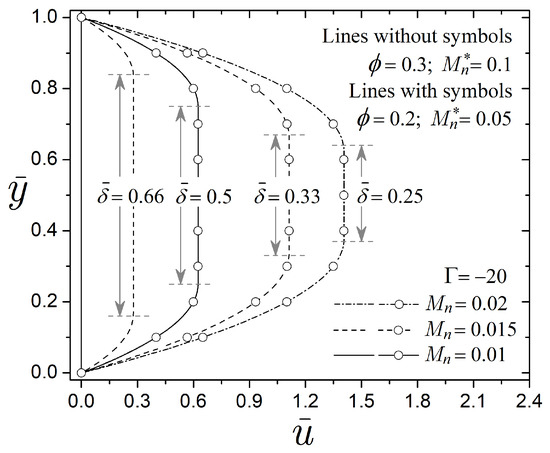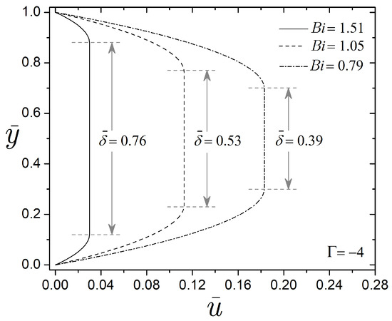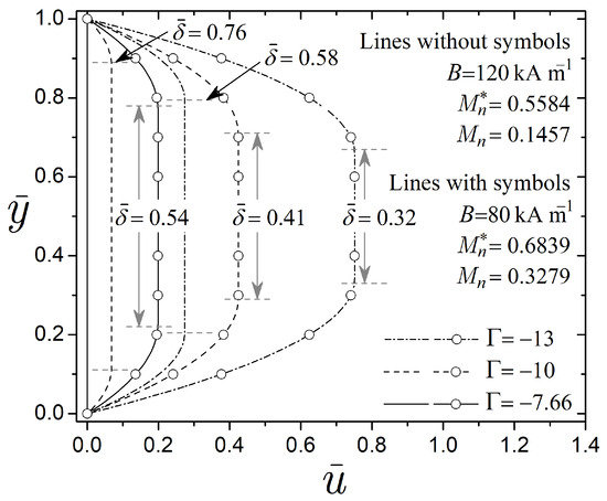 In particular, the relationship between interfaces is obtained by equating Equations (46) and (47). Also, the velocity profiles in Equations (44) and (45) depend on the interfaces and , which establish the pre-yield thickness. Without a magnetic field strength, there is no solid region, and the interfaces and will indicate the maximum velocity position at . On the contrary, the interfaces and will have different positions when a magnetic field is applied.