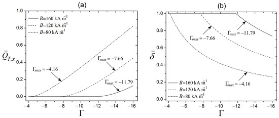 For this analysis of results, the following parameter ranges establish the corresponding values of the dimensionless parameters: , , Pa s, T m A−1, , kA m−1, kA m−1, and 12,000 s−1 [2,27,28,31,38,41]. The MR valve assumes the following geometry and piston velocity: m2, m, m, m, and m s−1 [21,22,23,24,42].