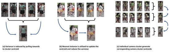 In response to these challenges, a wide range of unsupervised learning methods have been designed to boost feature discriminability and clustering reliability. The study in [11] proposed an Ensemble of Invariant Features (EIFs) method, which integrates global features extracted from a pretrained CNN and region features derived from a bidirectional Gaussian mixture model to enhance robustness to pose and viewpoint variations. To mitigate camera-induced bias, ref. [12] introduced a camera-aware contrastive learning framework using time-based clustering and a 3D attention mechanism to decouple features from camera dependencies. Addressing the noise in pseudo labels, this study in [13] proposed the PPLR framework, which leverages the consistency between global and part-level features to refine labels and improve feature discriminability. Furthermore, the research in [14] presented Cluster Contrast, which computes contrastive loss at the cluster level and utilizes momentum updating to maintain feature consistency in the memory bank. To alleviate sub-cluster fragmentation and identity confusion during clustering, the research in [15] developed the ISE method, which generates boundary support samples via progressive linear interpolation and applies a label-preserving constraint to enhance cluster compactness. These representative approaches provide effective solutions for USL Re-ID, laying the foundation for further research in this direction. While these methods address specific aspects of the problem, they often operate in a piecemeal manner. A fundamental and underaddressed challenge persists: the misalignment between empirically computed cluster centroids and the theoretical, invariant centroid for each identity. This misalignment arises from two main sources: (1) the inherent noise in pseudo-labels generated by clustering algorithms, which leads to incorrect optimization directions; and (2) the significant intra-class variation induced by cross-camera discrepancies (e.g., viewpoint, lighting). These factors cause the computed centroids to deviate from the ideal invariant representation, ultimately degrading model discriminability.