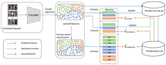 Various clustering algorithms have been explored, such as DBSCAN, hierarchical clustering, and the widely used K-means algorithm [34,35,36]. Fan et al. [37] proposed an unsupervised framework using K-means for pseudo-label generation, followed by model refinement. Lin et al. [38] extended this idea by introducing bottom-up clustering and an online memory module to maintain feature consistency across training epochs. Addressing person re-identification from a novel perspective, Wang et al. [25] transformed the conventional framework into a multi-label recognition system. A key innovation in their work was the integration of an evolving feature repository to boost algorithmic resilience.
