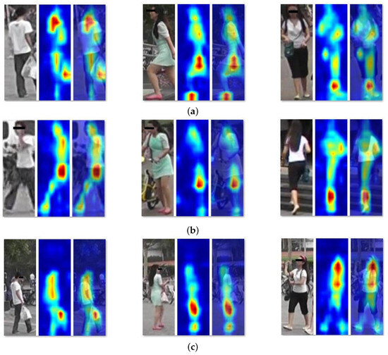 Figure 4. Grad-CAM visualization of ICCL predictions on three representative individuals under diverse conditions. (a) Consistent attention across multiple viewpoints (front, side, back) with strong focus on identity-specific regions such as upper clothing and accessories. (b) Robust localization under occlusion and interaction with background objects (e.g., bicycle), where the model maintains focus on torso and leg regions. (c) Scale-invariance test, where resized images still yield concentrated attention on discriminative body parts, confirming ICCL’s robustness to image scaling and background clutter. The red-yellow regions indicate high attention, while blue areas represent suppressed background information.
