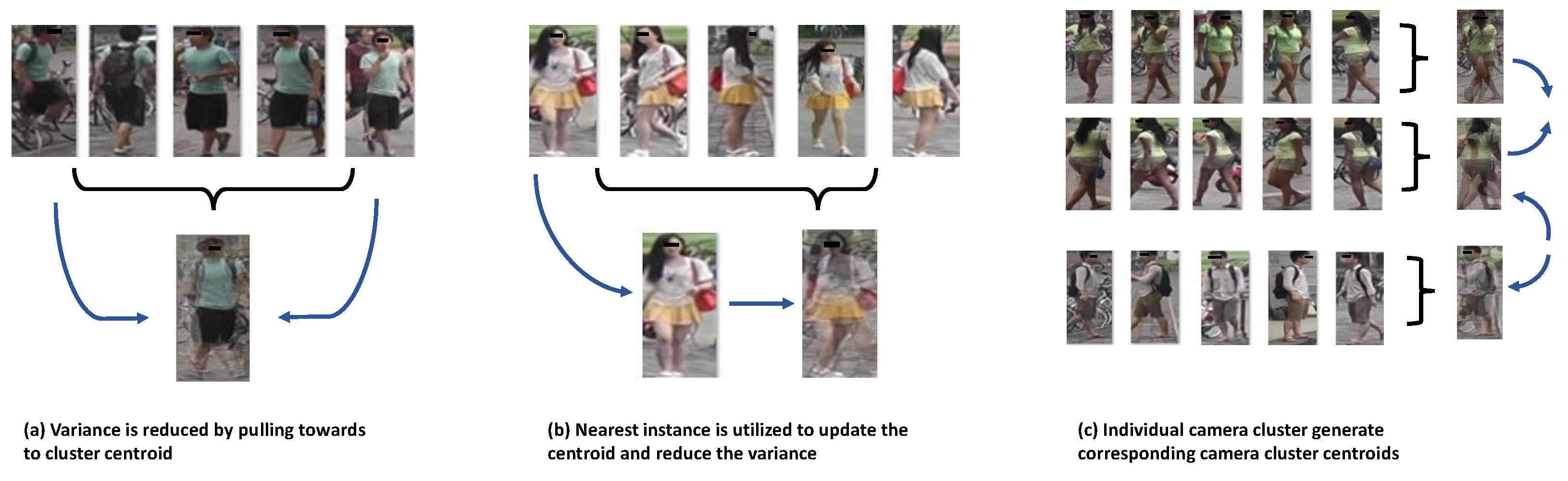 Figure 1. Illustration of invariance constraint in person Re-ID. (a) Variance between representatives and centroid are reduced by pulling together to the centroid. (b) The feature that is the closest to the centroid is obtained as the cluster representative, and the samples are pulled together to reach the closest feature instead. (c) Within each cluster, we select samples captured by different cameras and create camera aware clusters, followed by operating the similarity matrix to compute camera invariance loss.