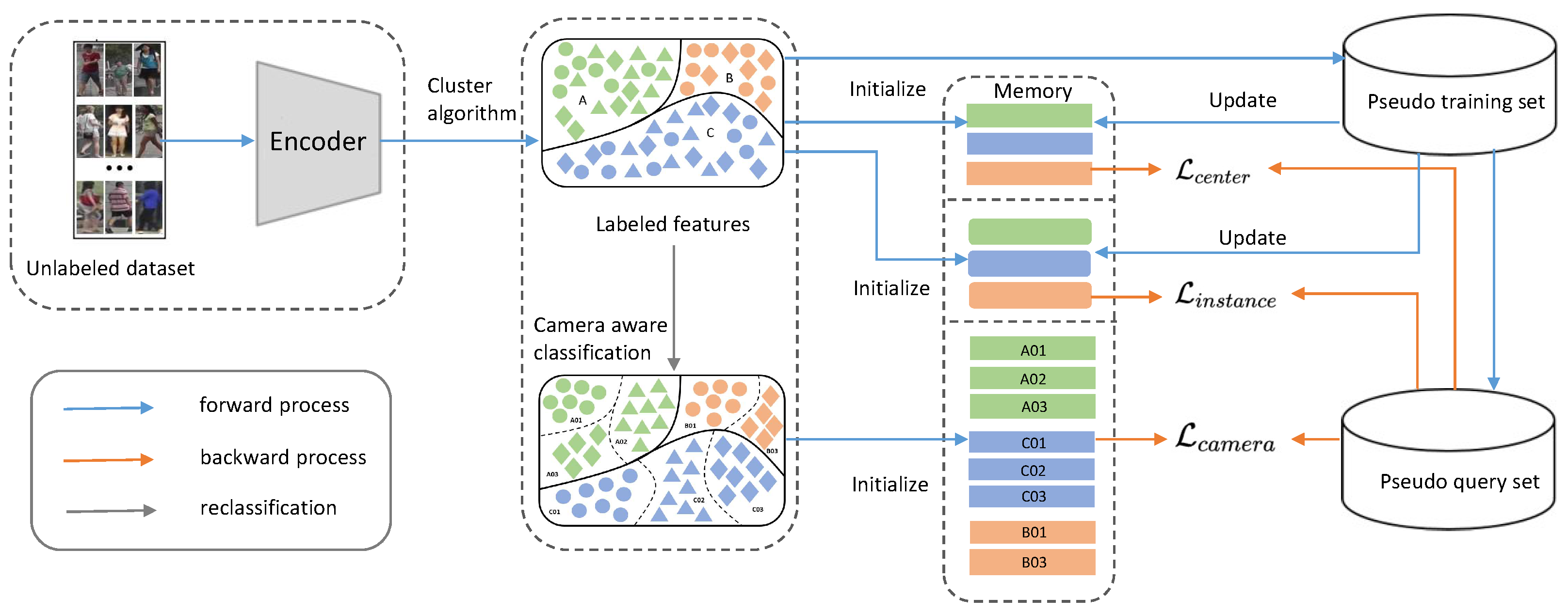 Figure 2. The ICCL framework for unsupervised person Re-ID begins by using an encoder to extract features from unlabeled images. A clustering algorithm is then applied to these features to generate pseudo-labels, forming the training set. Based on the pseudo-labels and camera identifiers, camera-aware classification is performed to capture cross-camera variations. Subsequently, invariance relations—including center, instance, and camera invariance—are computed and stored in corresponding memory modules, which are continuously updated with newly extracted features. Finally, multi-invariance losses are calculated by integrating the three individual loss components, and the overall loss is backpropagated to optimize the encoder.