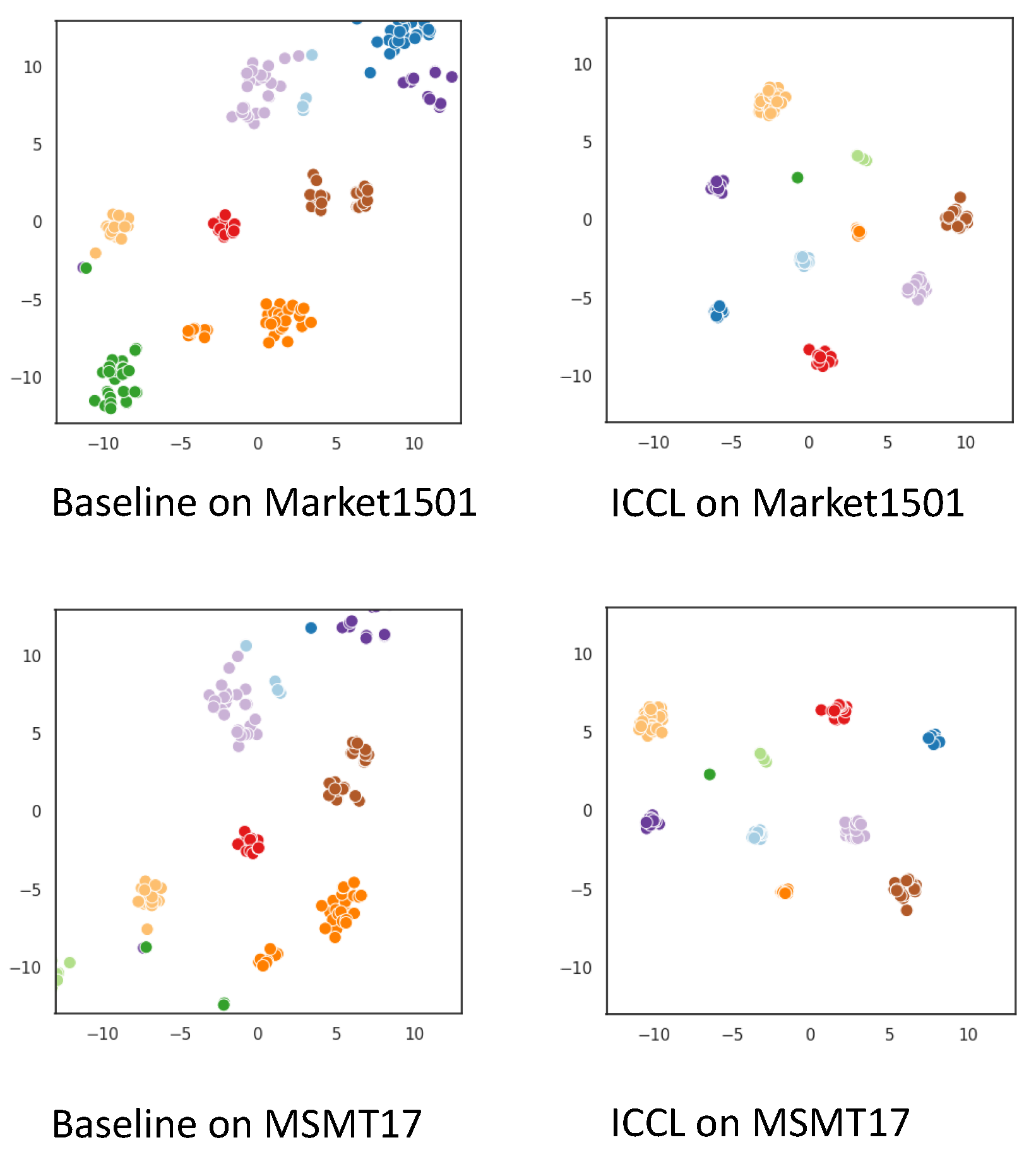 Figure 3. t-SNE visualization of feature embeddings for 10 randomly selected identities from Market-1501 and MSMT17 datasets. Each point represents one image feature and colors denote different identities. (Left): Baseline model features show overlapping and dispersed clusters. (Right): Features learned by ICCL exhibit compact, well-separated clusters, indicating stronger intra-class consistency and improved inter-class discrimination.