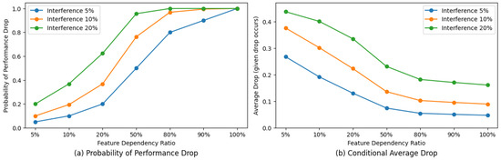 We first calculate the importance of different features using XGBoost [10]. Then, we select the top 5%, 10%, 20%, 50%, 80%, 90%, and 100% of features, and use them to train an MLP. (a) For the MLPs trained with features at different proportions, we perturb 5%, 10%, and 20% of random features. Through multiple tests, we record the probability of performance degradation. (b) We also compute the average performance degradation across all cases where the MLP shows reduced performance during testing.