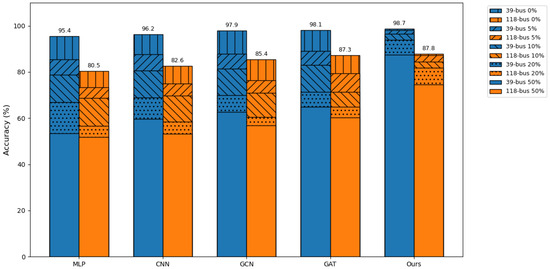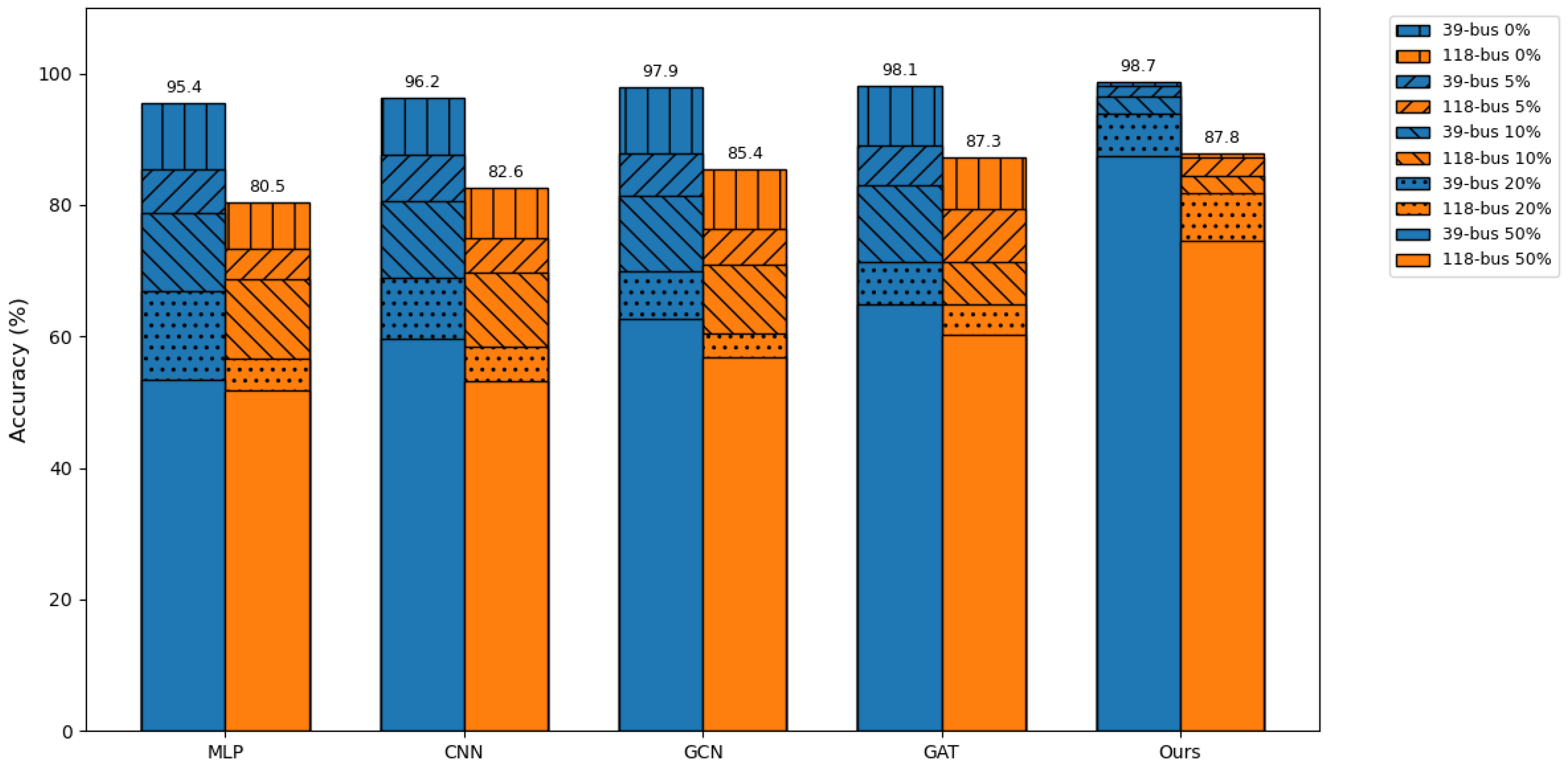 When perturbations are introduced (5%, 10%, 20% and 50%), all baseline models (MLP, CNN, GCN, GAT) show significant performance degradation. For instance, in the 39-bus system, MLP’s ACC drops from 95.44% to 53.36%, while CNN drops from 96.25% to 59.63% at 50% perturbation. In contrast, our method maintains a high performance level even under severe perturbations, with ACC/F1 scores of 87.46%/87.20% for 39-bus and 74.63%/73.71% for 118-bus at 50% perturbation. This demonstrates that our method is highly robust to input perturbations, significantly reducing the negative impact of disturbances.