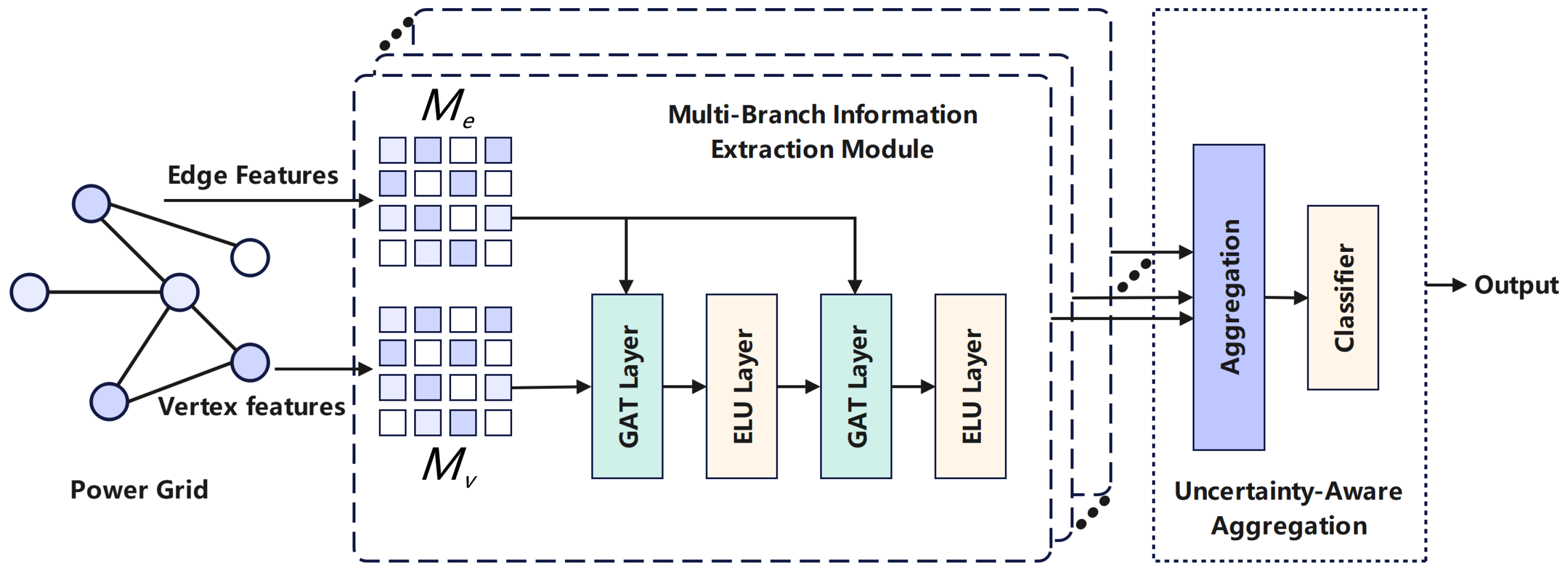 The advantage of this type of method lies in its ability to fully exploit power grid topology, thereby enhancing modeling capability and prediction performance. However, most existing studies assume that the input data is reliable. They lack systematic modeling for measurement noise, missing features, and uncertainty. In addition, their information aggregation strategies are often fixed, making it difficult to adjust dynamically when branch predictions diverge. As a result, robustness under noisy or disturbed environments remains insufficient.