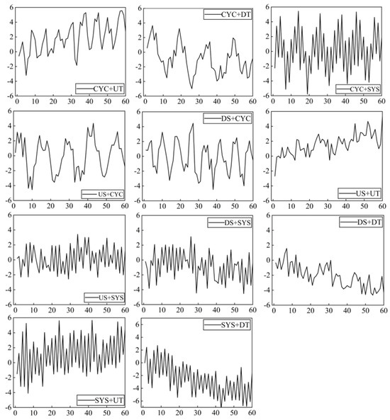 Regarding the observation that all patterns yield only two IMFs and one residual, this is a natural outcome of EMD’s adaptive mechanism for concurrent CCPs. Since each concurrent pattern is composed of two single abnormal patterns (e.g., CYC + UT, US + CYC), the signal contains two dominant frequency scales (e.g., high-frequency cyclic oscillations and low-frequency trend). EMD automatically identifies these two scales and extracts them as two IMFs, while the residual captures the remaining trend or DC component. No decomposition level is predetermined—this result aligns with EMD’s ability to match decomposition depth to signal complexity (Huang et al., 1998 [34]; Zhang et al., 2021 [35]). The one-dimensional raw data are divided into a series of IMF and R components effectively expressing the features of the raw data at different scales. To select the components with obvious features, the correlation coefficient is expressed by the following formula: