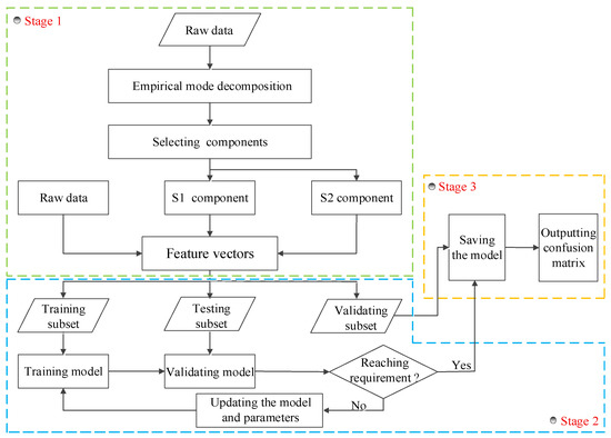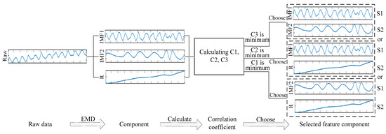 In this paper, the correlation coefficient is adopted as the selection index for S1 and S2 components, which are highly correlated with raw data. The selection detail of S1 and S2 components is shown in Figure 5. At first, raw data is decomposed into IMF and R components. Then, C1, C2, and C3 are calculated according to Formula (11). C1 is the correlation coefficient between IMF1 and Raw data. C2 represents the correlation coefficient between IMF2 and Raw data. C3 means the correlation coefficient between IMF2 and Raw data. The correlation coefficients between each component and raw data (taking CYC + UT pattern as an example) are provided in Table 2 (previously missing), which clarifies the selection basis of S1 and S2. C1, C2, and C3 are equal to 0.5927, −0.0144, and 0.7620, respectively. As a result, both IMF1 and R components are selected as S1 and S2 feature components. Finally, the feature vectors S1, S2, and Raw data are combined linearly, and used as the input of the classifier.