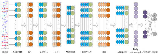 The structure of 1DCNN based on the BN layer is shown in Figure 3, which includes the input layer, three convolution layers, two pooling layers, three BN layers, one full connection layer, one dropout layer, and an output layer. The convolution and pooling layers are used to select, extract, and optimize features for gaining depth features. Because the pooling layer does not change the distribution of features, the BN layer is only applied after the convolution layer, and the dropout layer is introduced to avoid overfitting. After gaining the depth features, the full connection layer completes feature fusion and reduces computation. Finally, the Softmax classifier realizes classification in the output layer.