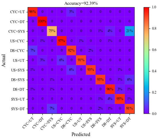 This subsection presents the experimental result of the proposed model. To display the details of the recognition for each pattern, the confusion matrix of the proposed model is given in Figure 6. The accuracy is indicated in the diagonal of the confusion matrix for each pattern, while the other values represent the error recognition rates. For instance, the 97% value in the fourth line represents the accuracy of the US + CYC, and the value of 1%, 1%, and 1% denotes that this type is falsely diagnosed as CYC + DT, US + UT, and DS + DT patterns, respectively. The title of the confusion matrix shows that the average accuracy of the 11 types of concurrent patterns is 92.39%. Notably, all patterns, except CYC + SYS (74.75%), achieve an accuracy of over 90%, demonstrating the model’s strong recognition ability.
