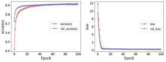 Figure 7 shows the variation curves of accuracy and loss for the training and validation sets. The training accuracy increases steadily with the number of epochs, while the validation accuracy stabilizes at approximately 93%, and there is no significant gap between training and validation accuracy—indicating no overfitting and good model generalization.