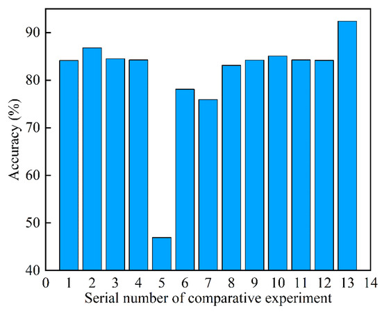 Initially, thirteen comparative experiments are conducted to validate the effectiveness of selecting S1 and S2 components, with the results displayed in Table 4 and Figure 8. The apparent inconsistency in Table 4 (e.g., 84.14% for Raw vs. 83.12% for Raw + IMF1 + IMF2 + R) is explained by the “noise interference effect”. Adding IMF2 (correlation coefficient = −0.0144) introduces irrelevant noise that offsets the useful information from IMF1 and R, leading to lower accuracy than raw data alone. In contrast, Raw + S1 + S2 (92.39%) avoids this issue by selecting only high-correlation components, which enhances critical features without redundant noise. This aligns with feature selection theory (Zhang et al., 2021 [35]), where “quality over quantity” of features determines model performance. It is observed that the recognition performance of the classifier varies depending on the feature vectors used as input. When the raw data is input into the classifier, the accuracy reaches 84.14%. The results of other experiments in which components and raw data are randomly combined as input are lower than the result based on feature component selection. In contrast to the thirteen experiments mentioned above, S1, S2, and raw data can effectively demonstrate the characteristics of the concurrent pattern. Results show that the accuracy increases from 84.14% with raw data to 92.39% with feature component selection, indicating the promising performance of selecting and combining feature components.