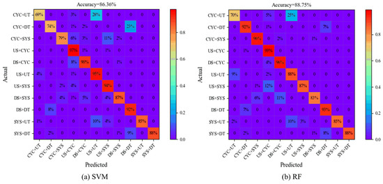 Secondly, to verify the performance of the 1DCNN classifier, three experiments are conducted to compare the accuracy of different classifiers, including SVM and RF classifiers. The RBF function is selected as the kernel function in SVM, with the parameters of RF shown in Table 5. Figure 9 gives the confusion matrices of different classifiers to identify feature vectors. The classification performance of 1DCNN clearly exceeds both SVM and RF, with the accuracy of 1DCNN being 92.39%, and SVM and RF being 86.36% and 88.75%, respectively. This advantage arises from 1DCNN’s ability to automatically learn high-level features from time-series data, whereas SVM and RF rely on manual feature engineering.