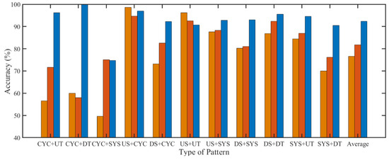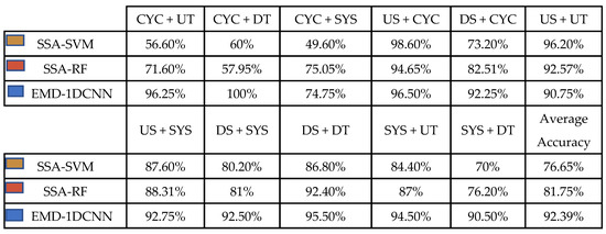 Finally, comparative experiments are implemented between our model and the two other methods to prove the effectiveness of the proposed method. One is the SSA-SVM scheme proposed by Xie et al. (2013) [23], and the other is the SSA-RF scheme proposed by Chiu and Tsai (2021) [30]. Figure 10 demonstrates the results of the proposed model and the two other methods. The results show that the average accuracy of the SSA-SVM method and the SSA-RF method are 76.65% and 81.75%, respectively, significantly lower than the proposed model’s 92.39% accuracy. The accuracy of each pattern of the EMD-1DCNN model is expected to surpass that of the SSA-SVM and SSA-RF methods overall. However, the SSA-SVM method demonstrates better accuracy for US + CYC and US + UT patterns, with a 2.1% and 5.45% higher accuracy compared to the EMD-1DCNN model, respectively. The SSA-RF method, which has better accuracy for CYC + SYS and US + UT patterns, is 0.3% and 1.82% higher than the EMD-1DCNN model. Therefore, it is clear that the proposed model performs well in terms of the average accuracy of eleven concurrent patterns among these three models.