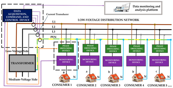 Considering the automation of distribution as one of the pillars of smart grids [19], in the particular case for PLB, an APLBS [20] involves the integration of various monitoring and switching systems [21,22,23,24,25], both local and general as follows: local consumer monitoring devices, local consumer phase switching devices (implemented at each consumer connected to the LV network) [26,27,28], data acquisition device, command and control of local systems (located at LV transformer substation), monitoring platform (located at the level of the transformer station), and data transmission conductors or the use of radio waves for communication between local systems and devices. The overall architecture of the PLB system for an LV distribution network is highlighted in Figure 1.