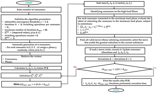 The well-known but constantly topical problems regarding electricity systems relate to the quality and continuity of the electricity supply. The asymmetrical operating mode of an LV distribution network causes a series of technical problems such as power losses, additional thermal stresses on electrical conductors, network instability, and disruptive effects on other networks [1,2,3,4,5,6,7,8,9,10]. A considerable amount of research has been devoted to the numerical simulation of PLB, implicitly the process management algorithm [11]. However, of great importance for the PLB process is the design of a flexible, simple, robust, and efficient algorithm that can be applied in distribution networks and that can respond to technical constraints.