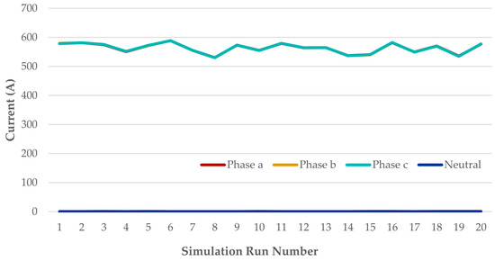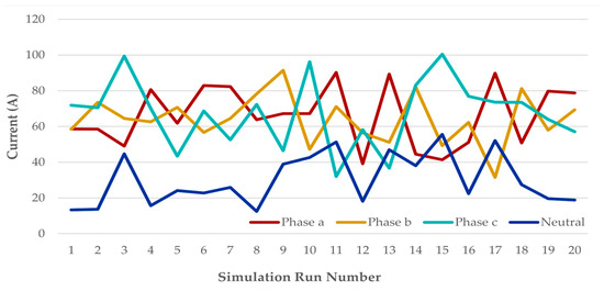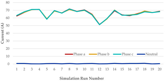 LV distribution networks are generally configured with three phases and a PEN conductor (Protective Earthed Neutral—which combines protective earth and neutral functions) [32]. For the mathematical model presented in this paper, the conductors are defined as follows: phase a, phase b, phase c, and neutral conductor N. Each single-phase consumer is connected to one of these three phases and requires a certain amount of current, denoted , for consumer , at a certain time. Balancing aims to maintain as balanced currents as possible on the three phases, thus reducing excess thermal stress on a particular conductor at a given time and reducing the current on the neutral conductor, implicitly reducing power losses.