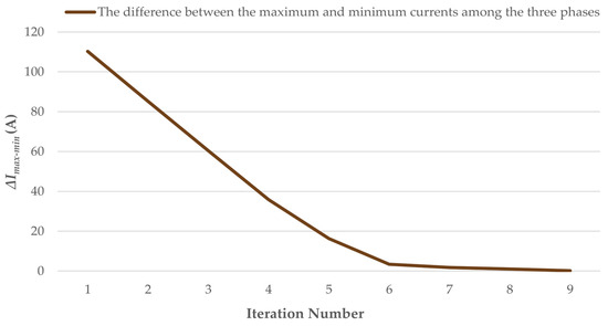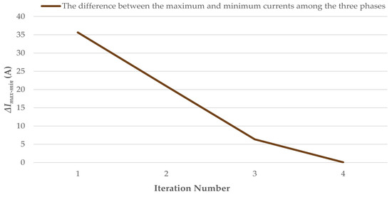The indicator chosen to be minimized at each iteration is the difference between the maximum and minimum currents among the three phases a, phase b, and phase c (current unbalance), respectively, defined as follows: