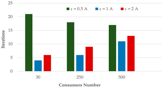 where –—current on phase j (iteration ); —iteration number; —consumption of the consumer that is moved to the minimum load phase; —minimum load phase; —maximum permissible current limit per phase.