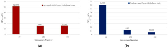 - The proposed algorithm strikes a balance between solution performance and computational cost given the following results after PLB: an absolute value of the neutral current below 0.63 A (99.62% relatively reduction), a reduced number of iterations (between 4 and 11 iterations), and increased convergence speed. The execution time of the algorithm varied as follows: scenario with 30 consumers (0.00051 s), scenario with 250 consumers (0.00257 s), and scenario with 500 consumers (0.01149 s);